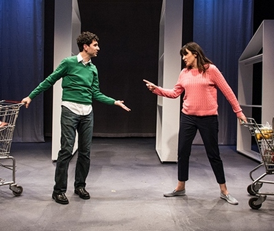 After all, much the same was the raison d'être of his best-known and most-produced work, Almost, Maine, a strange-sweet spin on rural romance that was first done in New York in 2006. But as is clear from the New York premiere of Love/Sick at the Royal Family Performing Arts Center, quirkiness cuts both ways. Whereas Almost, Maine was optimistic, and frequently fabulistic, in presenting its wacky tales of simmering passions in the frigid Northeast, things here are more somber and not at all dreamlike. That may make Love/Sick more realistic and relatable for anyone who has stumbled, perhaps violently, in the quest for the perfect partner (which, let's face it, is pretty much everyone), but it also makes it less transporting. As he did with Almost, Maine, Cariani has divided the script into multiple short scenes, each of which details a different couple dealing with joint maladies both physical and emotional. Even over the course of merely 80 intermissionless minutes, that many stories of loss and failure, with only the occasional (marginally) redemptive interlude, can become oppressively cynical. Though Cariani, as always, combines his unique perspective on these matters with plain language rather than rote poetry or self-consciously circuitous dialogue (à la the equally creative but more mechanical Will Eno), his brighter and zanier Twilight Zone views on modern dating, mating, and marriage are better suited to comedy than tragedyand, for better or worse, that's the category to which this effort belongs. In the first playlet, for example, two shoppers at a Walmart-like Supercenter discover when they collide carts that they're "obsessive impulsives," who must medically fight their innate inclinations to give in to every whim, even going so far as to kissmore accurately, make out withevery stranger they see. But despite having everything in common, they've been so trained to accept themselves as abnormal that they can't recognize an organic response for what it might be, and that causes years' worth of problems in the first ten minutes or so they're together. This is a clever start, but that cleverness diminishes when every subsequent scene goes in the same direction: a singing telegram goes hideously awry, hysterical deafness threatens to derail an otherwise perfect match, a man and a woman discover they missed a crucial step on the path to their wedding day, one pair finds their original fire going out while another notices too late that theirs is probably already gone, children cause problems through both their absence and their presence, and two aging through-the-wringer exes learn that trusting others is pretty hard after your second divorce. It does help that Cariani has structured the evening so as to suggest one complete relationship cycle, letting Love/Sick seem to cover a lot more ground than it technically does. But without an accumulative benefit to the misery most of these 18 people experience, you're investing a lot of time in watching a lot of people go nowhere, and most of their individual stories aren't quite compelling enough to make that particular non-journey anything but frustrating. Chris Henry's production is also not exactly ideal. It's set in the Supercenter, which serves as an unlikely link between the plays (the set is by Shannon Rednour) and adds an additional chilling effect of cavernousness despite Lucrecia Briceno's upbeat lighting. The songs between many scenes (written by Henry, Barton Kuebler, and Lars Jacobsen), which are danced by five women in Supercenter uniforms (Joann M. Hunter is credited with "movement direction"), function as both quasi-Brechtian commentary and time-killers for switching between Lux Haac's costumes, and disrupt what little flow Cariani's script might have been able to generate. The cast, though, is on the mark, with Simone Harrison, Debargo Sanyal, and Dee Roscioli all finding a winning balance between their characters' crazy and crushing feelings. The fourth actor, Justin Hagan, was recently injured, and has been temporarily spelled by about the most ideal replacement performer imaginable: Cariani himself. As Cariani proved when he appeared in Transport Group's Almost, Maine last year, he's his own writing's finest interpreter, capable of melding cool, antic neuroticism with charming warmth, letting him simultaneously exist in both his fantastical world and our sadly real one. His every word and facial tic is overlain with a quixotic hopefulness that transforms the sad and the ecstatic into the most natural of bedfellows. Too often, alas, this ability is wasted on Love/Sick, which is determined to salve pain with laughter the pain doesn't obviously deserve.