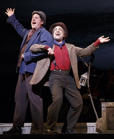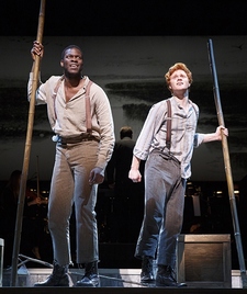 DeBessonet ensures everything moves well along these tracks, which helps. But this approach ends up transforming everyone outside the central foursomeHuck (Nicholas Barasch), Jim (Kyle Scatliffe), the Duke (Christopher Sieber), and the King (David Pittu)into extras rather than integral participants in the narrative. This can make it seem like the only reason to bring on the slave characters is to sing a spiritual or a gospel number (even though, in the second-act installment, "How Blest We Are," Katherine A. Guy acquits herself admirably). Even more than that, it diminishes the atmosphere and culture that are so essential to capturing the most of what Big River can be. It doesn't matter how good Rob Berman's orchestra sounds playing Steven Margoshes and Danny Troob's down-home orchestrationsand it sounds very good, indeedif it all comes across as literature night at a condemned honky-tonk. Scatliffe (the recent revivals of Les Misérables and The Color Purple) is an excellent Jim, singing beautifully (he makes the formulaic "Free at Last" into one of the evening highlights) and bestowing a quiet dignity to the part without weighing it down. Sieber and Pittu wield every weapon in their considerable vaudeville-comedian arsenal, and torch the place in the best possible ways. Barasch, late of She Loves Me, is an amiable Huck, but by far the lightest and least charismatic of the principals. The ensemble counts some major talentLauren Worsham, Cass Morgan, Annie Golden, and many othersbut their impact is negligible. Only Charlie Franklin, in the supporting part of Tom Sawyer, escapes from the background, and then only occasionallyno one is really supposed to care about him, right? The problem with Big River in general, and this version in particular, is that you don't really care about much else, either. Except, that is, for the Mississippi, which looms so literally and figuratively large that there's no escaping its influence. Maybe deBessonet should have learned another lesson from it: Sometimes there's value in doing something other than just keep rolling along.