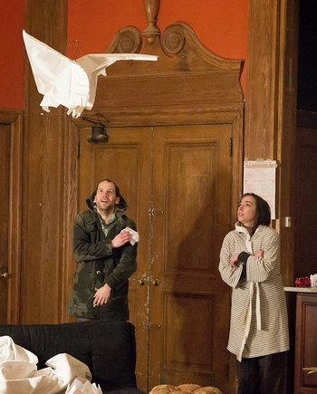 That choice of location is not accidental, by the way, as we discover in the haunting (and disturbing) final scenes set in the trip's aftermath, but nothing in Animals Out of Paper is. Joseph has composed a tight three-hander in which his characters' spirits are inextricably wrapped in their art, letting us see the myriad ways they deal with inspiration and disappointment, and, most important, the search for their truest selves. That's a difficult journey, given just how little any of them is willing to admit about who he or she really isthis causes problems, of coursebut watching it play out is itself a rewarding one. Set designer Ran Xia has made extravagant use of the sprawling playing space, capturing the cluttered essence of Ilana's living situation as well as the emptiness of her soul; even the acoustics of the room, which early on threaten to swallow lines, seem to grow sharper and warmer as the relationships better jell. Merri Milwe's direction maximizes intimacy, letting the various scenes between two characters (all three rarely share the stage together) enhance the emotional curiosity or hesitancy from which they all suffer. Beck is charming as Andy, eliciting all of his naturally nervous qualities in actions as sweeping as confronting his idol or as tiny as donning or removing his jacket; he really seems to treat it as though he believes it doesn't want to touch him, which adds a sad pathos to a man you can't help but like. Otero tends to mistake brittle for lost, lessening the aura of defeat that surrounds her in much of the first act, but she's much stronger dealing with the implications of the men's actions and hers in the scenes to follow. There's a bit of hard-sell in Sasikumar's portrayal of the cocky Suresh that thankfully evaporates once we need to see just how much weight the young man must carry. It's not easy for him, or for Andy or Ilana, to maintain the illusion of coping, and when falls, as fall it must, sparks and searing words fly. By the end, those shattered fantasies have gone, and it's clear that their remnants will remain to wreak havoc for a long time to come. But Milwe and her actors leave us knowing that that's okay. So what if manipulated paper doesn't return to its original self? There are endless, gorgeous wonders that can only result from making that first, dangerous fold.