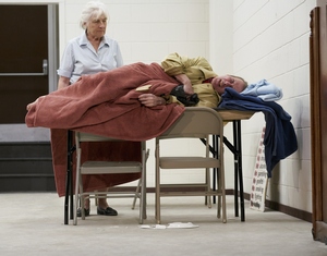 Ms. Allen and her co-star, the professional actor Kevin Hurley, are recreating the roles they first played over a decade ago in the original production of the play. Despite her outsider status in the field of acting, Ms. Allen, whose own career has been in nursing, won an Obie for that 2004 performance as Rosemary, the septuagenarian proprietor of a no-nonsense drug and alcohol rehab center, where, she says, it's all about "the 12-step program, faith-teaching, and work therapy." The play focuses on Rosemary's interactions with one of her new charges, Kevin (Mr. Hurley), who is self-absorbed, manipulative, and prone to be self-destructive; at one point, he refers to himself quite rightly as a "monster and a friend." Over the course of the play, the two of them bicker and quarrel, agree to the occasional truce, sing horribly off key, wash dishes together, and even have a sudden and altogether unexpected sexual fling. (The stage directions read: "they kiss, move to table, undress, then fucking.") That moment of coupling leads to the some of the funniest lines of the play, as the abrupt absurdity of the unforeseen encounter, mingled with a sort of off-the-wall tenderness, sinks in both for them and for us. All of the action takes place on an institutional-looking set lit by institutional fluorescent lighting (Stephanie Nelson is the designer) that looks more-or-less like a cafeteria in (where else?) an institution. One table set to the side serves as the bed in Kevin's tiny room. Along the back wall, there is a kitchen with a swinging door that opens and closes with a bang, in a way that is out of temporal sync with its actual use by the characters. Shaped by the discordant effect of the empty line readings and similarly dispassionate performances of several songs written by the playwright, Good Samaritans takes on a surrealistic, dream-like quality, so that it is not hard to imagine that what you are experiencing is going on inside Rosemary's mind. It's as if she is remembering or imagining a love affair with one of her former charges, who came into her highly regimented life, briefly upended it, and then disappeared. If you attend a play in order to be caught up in the emotional connectedness between characters, or even if you are looking for richly layered performances to lead you to a cathartic theatrical experience, best stay away from Good Samaritans. But if you are willing to allow your disbelief to remain unsuspended and are prepared to look for the human spirit underneath the cardboard-seeming characterizations, you might just find yourself discovering and connecting with that spirit in Rosemary.