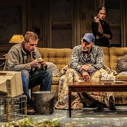 The barrenness of both the ramshackle Midwestern house in which the play is set and the people (more or less) within it is on full display well before the play proper begins. Although Dodge (an outstanding Ed Harris) is planted on a ratty sofa and seemingly watching television, there's no question that his heart and mind are actually engaged elsewhere. So much so, in fact, that he appears almost otherworldly, and not in a good way: ostracized from the civilization we think we recognize to the point that rather than a man he resembles more an alien (at best) or a ghost (at worst). He shifts, flinches, and itches at restraints we can't see, fighting violently against an unseen enemyspiritual inertia?before a word of dialogue is spoken. Once it is, we get a better idea of where he's coming from, with his wife of many years, Halie (Amy Madigan), shouting at him, unseen, from upstairs. "You know what it is, don't you?" she bleats in a deadened drawl. "It's the rain! Weather. That's it. Every time. Every time you get like this, it's the rain. No sooner does the rain start than you start." She's referring to his coughing (choking, really), at least in technical terms, but even at this early point you wouldn't be surprised if any tangible life force were to inspire an allergic reaction. Though he's barely said a word and we haven't seen her yet, it's obvious they're both sun-parched from the inside out. Hardly better is Tilden (Paul Sparks), their grown son, who seems more wrong still. Perhaps he's not brain dead, but he's also not rightas though his essential being had been ripped out of him and the wound it left behind left to fester forever. Like an over-aged toddler, he reacts in glee to the corn he's pulled from the back yard, against all odds and common sense ("There hasn't been corn out there since about 1935!", Dodge muses), yet is unable to process what it means. Shepard has plunged us into his own quasi-modern (Buried Child premiered Off-Broadway in 1978, and appears to be set in about that year) American drawing-room drama, what a title of the classic variety might look like on the eve of the apocalypse (or even the day after). Invading this serenity soon after are Vince (Nat Wolff) and Shelly (Taissa Farmiga). He's Tilden's son and thus Dodge's long-absent grandson, obsessed with returning to his family; she's searching for the Norman Rockwell–styled dream she's never known. Both are shocked by what transpires upon their arrival, when no one recognizes Vince, and they become embroiled within the myriad emotional struggles unfolding within the walls. Without spoiling muchand Buried Child, even after winning the Pulitzer Prize and being performed countless times over the decades (including in a Broadway revival 20 years ago), retains the ability to shock and stunthe travails and their resolutions, such as they are, are related as much to their present relationships as to the play's title.