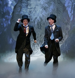 After all, there's something illuminating and inspiring about witnessing a master decades into his career ply his craft as though he were fresh on the boards. And when it's good, it doesn't matter if it's familiar. (There's the matter of the old dog, again.) So even though Irwin, Shiner, and Landau were just here three years ago, when Old Hats made its New York premiere in the same theater, there's a good reason for this revival: They've improved both it and themselves. That's not to say that the show (or at least their portion of it) is substantially differentit's not. A few bits are gone, a few others have been added, but it's substantially the same celebration of the bygone variety art it used to be. (G.W. Mercier's turn-of-the-20th-century sets and costumes and Wendall K. Harrington's elaborate, busy projections establish a charmingly clashing tone.) But as a result of either the tweaking or the time that's passed, the stars are even more comfortable in it now, and it seems more necessary and urgent. As though time, for them as well as what they do, is running down, and they need to commit it to the public's memory before it's too late. It will certainly be a long while before I forget their political debate sketch (interesting, because it was not one of the elements that lingered long in my memory last time), which draws from the surreal idiocy of the electoral process enough cliches for both to embrace (as dueling candidates) and topple. Maybe it's just the out-of-control equivalent in our own world that emphasizes the depths of its inanity, but through their frantic miming, raucous physical comedy (the duo's promises put obscene new spins on the concept of "pulling a leg"), and cracker-jack improvisational skills (a couple in the front row that let out one chuckle too many became the target of Irwin's character's irefor the skit and then the rest of the show), but for those few minutes, there was never more to laugh about.