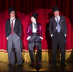 But what Landau keeps firmly present throughout it all is the artistry of what they do, which in its razor-honed precision makes their most impossible gags look like things anyone could do. (Though, uh, I would not encourage you to try them at home.) And with the enhanced sense of this all as a last hurrah (or, at any rate, a climactic one), the go-for-broke-but-don't-actually-break-it atmosphere becomes palpable in a way it's never been before. "Will they or won't they? Of course they won'tthey never do. But maybe this time...?" It was in the overall structuring of the evening that the pair stumbled last time, because what they were doing could not be easily reconciled with the show around them. The third cast member has changed all that, however. Singer-songwriter Shaina Taub, who with her band provides the music (more than half a dozen original songs), brings to Old Hats not only a vital contrasting personality but a willing accomplice in their shenanigans. Whereas Nellie McKay, who assumed the duties last time, never felt completely at home among the wackies, Taub does. So when she steps into the spotlight near the end, equal parts gorgeous and gawky, to sing and strut alongside Irwin and Shiner in the song "Lighten Up," she's signaling that she's one of them. We have no reason to disbelieve her, because by that point we've seen her numbers and her mien progress from vaguely cynical to tolerant to accepting and ultimately playful: the evolution of comedy, if you will, or at least a future comedian. Will her "character" end up where Irwin and Shiner have? Probably not. But who can say? Anything, they have taught us, is possible, whether you're an old dog or a young pup who's willing to sit back and be shown how it ought to be done.