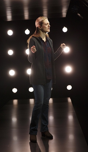 On the Exhale, which filters all of these issues through the psyche of an unnamed mother (played by Marin Ireland) who loses her first-grade son to a school shooting, is at its most convincing and affecting, however, when it considers the greatest enemy of all: fear. After all, you needn't look too hard on the news or on the Internet to find a dazzling array of gun arguments, pro and con. So merely rehashing them, or rather one side of them (from the perspective of this woman, a lesbian women's studies professor, pro-gun-rights positions are not to be taken seriously), is fundamentally pointless. Focusing on the theatre's ability to dig beneath the rhetoric and show us the soul that inspires it is, unsurprisingly, far more effective. So rather than dwell on plot, Zimmerman ushers us into the mind of this inside-outsider, who sees in every frustrated male student a potential Dylan Roof (she nicknames a particularly unsettling one "The Catalyst") but is clear-eyed enough to know that there's always something to be done. That's why, when her son Michael becomes a victim, she's determined not to be one, too. But in her attempts at protest, she visits the store where the killer purchased the unnamed weapon (it's described only as an "assault rifle") that slaughtered Michael, and finds herself allured by its power, simplicity, and her natural facility with wielding it. So much so, in fact, that she purchases it and begins practicing regularly at the local shooting range. The exploration of how one kind of zealot flirts with becoming another (or at least spiritually sympathetic) is fascinating both for the combination of its speed and its smoothness, and the way it highlights the fragility of emotions that catapult us beyond our normal comfort zones. Ireland is superb in these moments; she's a fastidiously intelligent actress, and that intelligence, so right for this professor, stands in captivating contrast to the visceral warmth that emerges when she takes life and death quite literally into her own hands. The battle between innate inclinations toward passivity and acquired developments that encourage us to act is waged in her every breath, her every glance (she surveys the gun, and the target she pierces using it, with a gaze approaching religious adoration), and the softening and catching of her usually sharp and precise voice. No matter how secure we are in our beliefs, there's some way we can get lost in anything. This fusion of acting, direction (by Leigh Silverman), and writing is On the Exhale at its best, because it levels out a piece that is otherwise rocky. The preachiness, even pretentiousness, of the professor is not an easy foundation on which to build a sympathetic story, and it leaves her too stalwart a symbol until she must face down her own prejudices. Zimmerman's choice to structure the entire one-hour play in the second person adds further distance, as we're forced to become less concerned about what did happen to her than what could happen to us. (Making the specific universal seems to be intent; it's only intermittently successful.) And though Silverman has helped Ireland craft a wrenching personality, her staging is at once static and restless: This tiny theater amplifies every motion, so Ireland's constant pacing on the all-black lecture-hall set (by Rachel Hauck) beneath Jen Schriever's stark lights (Jen Schriever) abandon us in the uncertainty of the woman's thoughts as soon as they deposit us there. The world around her fails to come to life because it's constructed from so many generic, regurgitated arguments, and is only briefly dislodged from its predictable axis by the mild intimation that the woman's ideological opponents may not be entirely wrong. After a few fleeting scenes of this romance, Zimmerman abandons it in favor of a return to the script's previous, facile form. The woman must fight the callous senator she believes disrespected her during her testimony about her son's death, which she does by deceiving her way into his home while her firearm is secured in her car, and confronting the choice of punishing him for his transgressions or taking the higher, more difficult road. You'll never guess which one she picks. Except you will, because, to rational people, some choices are genuinely unthinkable. Yes, Zimmerman spins this play entirely from the woman's point of view, its words and opinions hers and hers alone, but it ends up proving her opponents' implicit (if, here, unstated) contention that personal responsibility and morality factor guide our actions more than physical tools. That the woman overcomes her personal demons of fear and hate by not giving in to them is all well and good, but she stops well short of deducing that her real journey is from myopia to tolerance, if not acceptance, of a mindset she once decried. Going all the way with that realization and its implications would be more daring, dramatic, and thought-provoking than the well-meaning but well-worn pabulum that is most of On the Exhale.