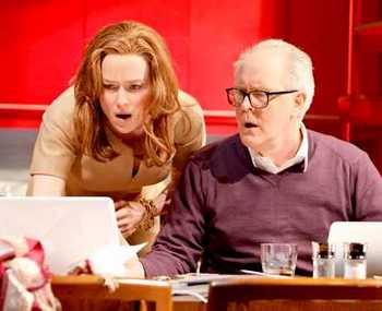 Of the roughly 69,105 he dispenses in under two hours, the number that are truly side-splitting can be estimated in the low double digits - and that's including a decimal point. Despite being uttered exclusively by two actors whose tongues know their ways around florid quips, John Lithgow and Jennifer Ehle, and staged by the hardly comic-averse Scott Ellis, the nonstop spouting of arch cleverness consistently drowns in its own desperation. And desperation is almost never funny. The exception, of course, is when it's rooted to character and circumstance - and then it can be hilarious. Beane himself proved this with his last major outing, The Little Dog Laughed (which Ellis also directed), which Second Stage premiered in early 2006 and which made it to Broadway by the end of that year. Its blend of jet-fueled entertainment power-players scheming for millions while street kids scrambled for pennies gave everyone sharply carved goals, which was more than enough to ensure some of the biggest comedy pay-offs New York theatre has seen in a decade. It's not exactly true that the New York gossip columnists who give the play its title have nothing at stake. Technically, their jobs are on the line. Celebrity blogs (which both always refer to as if vomiting), anonymous chat rooms, and Twitter have made choice scoops hard to get, so when they exaggerate the semi-luminaries at one event and end up naming someone who died earlier that night on the West Coast, they're done for unless they can score some juicy news about someone truly scintillating. So they do what any self-disrespecting journalists would: they make up someone. And their creation, a young firebrand named Jamie Glenn, reignites not only the libidos of androgynous socialites, but also the gossipmongers' careers. "Reality is the new fiction," Mrs. tells Mr. - and such a statement could fuel many a Beane play (and has). Just not this one. In part, this is because Beane sets up the Fitches' lamentations about popular art versus truth so baldly that there's nowhere else for the story to go. But it's even more because after spending the hour-long first act unveiling an idea that could have been explained in 15 lines of dialogue, all the wheel-spinning does little more than cut huge holes in Allen Moyer's sumptuously stylish Manhattan loft set. When you have nothing to say, saying it well is seldom very easy. So Beane resorts to filling out the time with his melting bon-bon mots: "Gossip is just news that's interesting," "Where are the porn supporting actors?", "I was drunk. I was tired. You should not let me make decision when I am drunk and tired. Look at the color of the hallway." More endless still are the strings of oh-so-clever Gawker-ish descriptors for the nameless rabble filling the parties they attend: She-Who-Will-Not-Be-Ignored, Himself-the-Elf, His Impoverished Lordship, Generalissimo de la Horror Show, Love-Her-Used-to-Hate-Her, Hate-Her-Used-to-Love-Her... You get the idea. But because the names are essentially used interchangeably and are connected to almost no concrete details about them, they can't be used to tell us anything about the Fitches. That which wouldn't be a problem if the actors filled in the gaps. But neither evinces any sense of populating or even understanding the Fitches' world. Ehle cuts the definitive figure of greasy elegance in Jeff Mahshie's society-clinging costumes, but chews every line for far too long for them to have the Gatling Gun impact they need. Though Lithgow was a shadowy master of menace playing gossip terrorist J.J. Hunsecker in the 2002 musical Sweet Smell of Success, here he always seems to be apologizing for the nastiness as he spews it. Ellis's sleepy direction doesn't help, and encourages the actors natural tendencies to present everything as a swirl of monotone that isolates us from both the Fitches' world and the real world. Beane's wishy-washy moralism doesn't help - he guides us to care about the couple succeeding only so we can later care about them failing, but never successfully demonstrates why either would be preferable. He paints the duo as so disconnected from reality that they don't belong anywhere. If that's the point Beane intended, the almost somber second-act conclusion is grossly misjudged. After all, Mrs. makes Mr. swear on their personal Bible - Susan Sontag's Against Interpretation - that he will never drag her to another deep-feeling event. "I shall do my best to shield you from all sincerity," he tells her, and maybe he means it - even if he can't live up to it. Beane, however, wants both the slick glitz and the honesty on a single platter, thus guaranteeing that neither looks appetizing. His message could only come across if the writing, acting, and direction were utterly unadorned and excess-free. Because they're not, Mr. and Mrs. Fitch is like a blind item that's obvious to even the densest reader: In other words, not nearly as much fun as it should be.