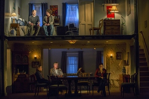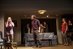 Surely not. Yes, there's a bit more to the philosophy of Michael Fischer than merely these incendiary notions he floats in his soon-to-be-published book Forgetting the Holocaust, but if they're as far as anyone gets, by any accounting that matters, they're all there is. As played by Jeremy Shamos, with a starkly intellectual mien and sharper-than-usual edges, Michael is an expert at painting himself the victim: of closed minds, of closed hearts, of a society that's more dedicated to defending Israel the place than examining what Israel stands for, and he's never afraid to let you know it. He feels the burden of history like no one else, and getting his point of view out there is, to him, worth any cost. Maybe even the tenure he's applied for. Michael's myopia, however, does not necessarily extend to the other members of his family. His wife, Ellen (Tasha Lawrence), isn't Jewish at all, though their (unseen) daughter Abby is in the midst of a trip to the Holy Land when the play begins. Michael's sister, Holly (Kate Walsh), is a high-holy-day Jew at best, with her husband Howard (Gary Wilmes) and son Joey (Seth Steinberg) all but entirely divorced from her faith. Sister Sharon (Maria Dizzia) is the most involved of the lot (until recently, she attended a "Conservadox" temple), but still harbors a connection mostly through her parents, whom she grew particularly close to when caring for their mother before her death. As for father Lou (Larry Bryggman), he was one of the Americans who liberated Dachau, and takes everything about the Jewish experience more personally and intimately than the others do (or can). Levenson, whose other plays for Roundabout include The Unavoidable Disappearance of Tom Durnin and The Language of Trees, and who provided the book for the currently running Broadway musical Dear Evan Hansen, unfurls this set of relationships in a swath of different directions that are all about fixing these people at a specific, anguished point in time: the end of 2000 and the beginning of 2001. They must battle not just each other, but the figurative ghosts of those who've come before and are still contributing to their humanity (or, perhaps, the lack thereof). These take on a variety of forms, with something different for everyone, until they coalesce in the jumbled final scenes into an understanding, or at least a perception, of the parts they play in perpetuating the line.