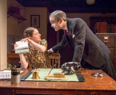 I have no idea if Brewer is the original iteration of this sort of office lothario in art, but I imagine he's one of the first. Since he stalked the stage, we've observed the antics of many similar rakes in theater, film, television, and literature; a few that spring immediately to mind are Kodaly in the musical She Loves Me (and that character's antecedent in the Mikos Laszlo play on which it's based), plus several "alpha males" from the early 60s New York business world as depicted satirically in How to Succeed in Business Without Really Trying and more straightforwardly in Mad Men. These works remind us that some aspects of interpersonal relations in business have changed greatly over the decades, others scarcely at all. In London Wall, Brewer (played by Stephen Plunkett) has selected as his primary target of the moment a young thing named Pat Milligan (Elise Kibler), who diffidently responds to his advances even though it's clear to the audience that she'd be much better off with Hec Hammond (Christopher Sears), the sweet kid who works in a neighboring law office and who's clearly nuts about her. A major subplot concerns Miss Janus (Julia Coffey), who gives older-womanly advice to Pat even as we learn that her own long-term relationship with the man she hopes to marry (a character we never see) is far from blissful. The performances of the above-named actors are so excellent that one can hardly imagine anyone being better in these roles. The same might be said for Matthew Gumley, Alex Trow, and Katie Gibson as other colorful figures in the office, and for the wonderful Laurie Kennedy as Miss Willesden, an eccentric client of the firm who at first seems to be on hand merely for comic relief but who ends up playing an important role in the plot. As if all that great acting weren't enough to make this production a treasure, it boasts astoundingly accurate and detailed set design by Marion Williams, including an old-time switchboard (or approximation of same) that's quite something to see. Bravo as well to Joshua Yocom for his one-hundred percent authentic-looking props; I can't imagine where Williams and/or Yocom found some of this stuff, and what kind of hunting was involved. Martha Hally's spot-on costumes complete the time-traveling magic, Nicole Pearce lights everything beautifully, and sound designer Jane Shaw has chosen deliciously mood-setting old recordings to play during scene changes and at the beginning and end of each of the play's three acts. The work of these artists is all the more impressive in that one can assume it was done on a tiny fraction of a Broadway show budget. The script of London Wall isn't absolutely flawless; some of the material involving the supporting characters seems unnecessary filler. But little matter. Van Druten had a great talent for creating stories of universal interest by limning specific characters in very specific times, places, and situations, here in this play and in such others as I Remember Mama and I Am a Camera. The Mint production of London Wall greatly aids and abets the author in this regard, not only in terms of the design elements but just as importantly through the efforts of the cast and dramaturg/dialect coach Amy Stoller in achieving well-honed accents for each of the characters, from lower-class Cockney to middle class to working class to upper class. (Henry Higgins would have had a field day with this group.) Only stage vet Jonathan Hogan displays a not entirely convincing, in-and-out accent as the firm's patriarch, Mr. Walker, but his performance is otherwise eminently satisfying. Last but not least on the contrary, perhaps greatest of all director Davis McCallum deserves vociferous applause for his near-perfect casting of this play, his thorough understanding of the style of acting required, and his ability to help the actors achieve that style across the board. London Wall is the very best of all the many fine Mint productions I've had the pleasure to attend over the years, an entirely praiseworthy resurrection of a little-known minor masterpiece.