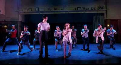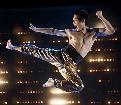 At the heart of this spectacle is, of course, Bruce Lee, whose slow simmer to stardom exploded into immortality in the early 1970s with The Big Boss, Fist of Fury, Way of the Dragon, and a couple of others, before his death in 1972 at age 32. But what Hwang is really getting at, and what gives the show what heft it has, is the playwright's returning to one of his core themes: the ability of culture (and show business) to transcend and even obliterate borders of the mind, the spirit, and even the planet itself. The last is what matters here, as Lee, who was born and lived much of his adult life in the United States, but was raised in Hong Kong by his opera-star father, represents one of the most succinct fusions of Chinese stateliness and American glitz to hit the big time. Lee first made his name on these shores in the short-lived pulp-crime TV series The Green Hornet, and that brought him enough fame in Hong Kong that he could write his own ticketwhich, in turn, led him to conquer the hearts and minds of violence-hungry American men for decades to come. He even married an American woman, Linda Emery. So all the frantic movement, the structured chaos, that pops in from the wings to punctuate the scene changes and nudge along the story makes sense after all. How better to demonstrate Lee's impact than by comparing the severe athleticism for which he's so famous with the lithe and angular ministrations of popular dance, as the idioms of the Old Country and the new collide in the music as well? Against Du Yun's rollicking clash-of-the-millennia score, choreographer Sonya Tayeh has so cannily blended ancient Asian steps with the liquidy go-go dancing of the mid-20th century that it's impossible to tell where one begins and the other ends. (Emmanuel Brown is the fight director.) From a street-gang brawl to the psychedelic set of The Green Hornet to an all-out battle on the set of Lee's first starring film, this ironclad marriage of the traditional and the trendy creates something more stirring, more exciting, and more eye-popping than either would be able to fashion on its own.