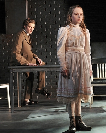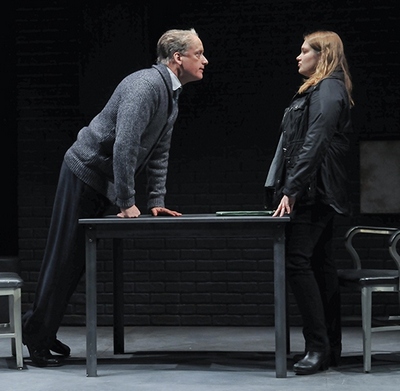 Employing a sense of all-consuming, just-past-the-boundaries-of-vision dread of the kind you typically find in Martin McDonagh plays (particularly echoing the authoritarianism of The Pillowman), Haley takes us to a world in the not-so-distant future when society has essentially been consumed by the "Nether." This is an invasive, super-Internet network that's populated by "realms," or elaborate VR sessions that tie in to all a person's senses and minds, and are so realistic that they've all but replaced traditional offices, schools, and... well, everything else. That naturally includes anything and everything illicit, and the alleged manager of one of the most notorious of these, a man named Sims (Frank Wood), is under interrogation by a female detective named Morris (Merritt Wever) when the play begins. Sims is charged with running The Hideaway, where solicitation, rape, sodomy, and murder are traded regularlywith very young children. Or are they? No one is exactly who he or she claims to be in the Nether, and the identity of the most tantalizing of the girls to be found in the Hideaway, the sprightly Iris (Sophia Anne Caruso), is a matter of constant debate. As is that of a young-ish man named Woodnut (Ben Rosenfield), who entered the Hideaway to discover whether charges against Sims (who goes by the name "Papa" when on the inside), and who did not emerge from the experience emotionally or spiritually unscathed. And what does Mr. Doyle (Peter Friedman), a middle-aged teacher with a particularly powerful attachment to Iris and devotion to Sims have to do with it?
