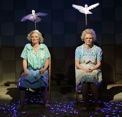 But that's only intermittently true. Laced through the sillinessof which there is plentyis a mature air of melancholy that's not at all in evidence in All in the Timing. What's more, the individual pieces, some of which are world premieres, some of which are New York premieres, and one of which (the title offering) was seen in New York 15 years ago, are linked by a powerful theme that builds and resonates anew as each new chapter unfolds: good people striving to avoid living bad lives. This idea emerges most fully in the second act "It's All Good," a quietly profound Twilight Zonestyle tale in which a successful author in New York named Stephen (Rick Holmes) returns to his native Chicago to speak at an event, and on the train meets a man (Carson Elrod) who bears a disquieting resemblance to his younger self. Steve, as he's called, embraced the Catholic faith Stephen left behind, married a woman named Amy (Liv Rooth) who's a lot like the one Stephen abandonedonly more, ahem, virtuousand had the kind of family Stephen was not aware he wanted with the woman he actually wed, Leah (Kelly Hutchinson). It's very much a "you-can't-go-home-again" story mashed up with a "you-never-know-who-you'll-become" fable, but it's serenely touching as it contrasts two "good" outcomes to the same "bad" beginning, and forces Stephenand usto question which is truly the better one. Ives provides no answers and leaves Stephen's fate in limbo when the lights fade for the final time, but it's a deeply satisfying investigation of the kind of regrets we all have at opportunities gone by, and beautiful, intricate acting from all four performers (particularly Holmes and Elrod, who adroitly echo each other while projecting vividly different personalities), makes it the undisputed winner of the collection. "Lives of the Saints" itself, the final entry, is nearly as good, as it focuses on two older women, Edna and Flo (Hutchinson and Rooth), who are preparing a funeral breakfast for a joint friend. Their actions of everything from setting the table to checking the Jell-o molds to scouring the cupboards are pantomimed, and their exaggerated sounds (salt pours mighty loudly in this universe) emanate from the sound system to underscore the surprisingly high emotional impact of each of these simple movements on the women.