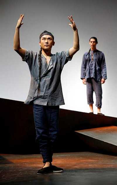 Mimi Lien's scenic design is, in other words, an ideal landscape against which to set David Henry Hwang's brief but impactful look at the collision of attitudes and cultures in the mid-19th century. The two Chinese men, Ma and Lone, who have come to the United States to help build the transcontinental railroad, are confronting many similar questions about their meaning and their roles in the process of creation. Lone was a promising opera actor who was spirited to America to earn money for his struggling family; Ma, even younger and more naïve, believed the legends he heard about America's wealth and freedom, and has come to pursue them so he may one day play the coveted opera role of Gwan Gung himself, an accomplishment for which Lone used to be headed. Because Ma doesn't understand the commitment required to attain such a lofty goal, and because the apparent death of Lone's hope has left his talent unused and his outlook cynical and hopeless, they're naturally poised to find the support and understanding they need in each other. And, presently sidelined by a strike that promises to grant Chinese workers more respect and better pay, there's plenty of time for them both to learn and teachand about more than just the lines, dances, and significance behind the craft that has consumed them both. Their joint determination, as filtered through both the heavily stylized format of the Chinese opera and the harsh realities of the working world they can't escape, represents an engaging attribute of Hwang at his youngest, freshest, and most experimental. (The Dance and the Railroad premiered in New York at The Public Theater in 1981.) Considerably more subtle and subversive than many of Hwang's recent plays (including Yellow Face and Chinglish), this one captivates as much by what it doesn't say as by what it does: The tragic undercurrents of Ma and Lone's quest for perfection are only gradually revealed, exploding in the climax that sees the two improvising a modern opera about their own compelling life stories, but otherwise trusting youlike the charactersto develop your own perspective and point of view. Neither the play nor the production is flawless. The running time of well under 90 minutes is not quite sufficient for exploring all the complexities Hwang introduceshe suggests that Ma and Lone have more interesting relationships with their white coworkers than ever materialize in dialogueand the work's limited focus does not always seem to agree with the breadth of its attempted scope. May Adrales's direction, which hits the proper notes but seldom lets them resonate as long or as deeply as they should, does not contribute much additional weight of its own, and is often unevenly paced. The actors compensate for many such minor deficiencies, however, with Yuekun Wu robustly embodying the wounded arrogance of the diminished Lone, and Ruy Iskandar even better at capturing the energetic and enterprising Ma as he works to make sense of the increasingly confusing choices he's made. When the two are immersed in lessons, such as when imitating ducks or locusts, or literally acting for their lives in the finale, they project a compelling kinship that reinforces the ways in which traditions, when challenged, need not always be lost. Of course, Hwang is not saying that the difficulties and disappointments that result from trying to hang on to those traditions are necessarily as constructive as what's torn down around them; and, remember, this is all unfolding on an impossibly artistic mountain that is itself being assaulted in the name of progress. The Dance and the Railroad provokes because it investigates the balance that may be found amid such sacrifices, and how it, too, can encourage development. If Lone and Ma's aspirations are endangered, we may at least find solace in the fact that their dreams remain fertile ground from which further inspirationand perhaps better livesmay yet one day sprout.