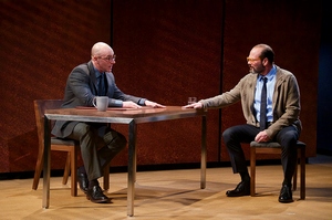 Sadly, getting there is far less than half the fun. The first act is a convoluted slog, looking movie-star handsome on Tim Mackabee's upscale office set as uncompromisingly lighted by Donald Holder, but dragged down by Mamet's prosaic, uninspiring dialogue ("One aspect of intimacy," Charles moans at one point, "is that it tests us. In... it proves us. In the old sense. It exposes us to trauma") and his even more leaden attempts to keep certain key discoveries secret until after intermission. (Considering that the whole show, including the break, runs about 80 minutes, one wonders why he and Pepe bothered.) Charles's plight is ill defined and its implications vague; if not for his amusing (and slightly awkward) explication on how the press is trying to destroy him for their own purposes, there would be nothing of substance to grab onto at all. Lage, however, is outstanding as Richard: wry, acerbic, loyal, and dangerous all at once, a vivid picture of a high-powered lawyer who is all too aware of the undue influence he wields. Gilliard wears a bit too broad of a sneer as Robert's antagonistic counterpart, but lands squarely as a formidable courtroom opponent in the single scene in which he appears. But despite the Rock of Gibraltar resilience with which Bauer invests Charles, he comes across as dull and reactive; Bauer can't patch the hole in the writing that casts this man as little more than someone terrible things constantly happen to. And Pidgeon is stilted and starchy throughout, never letting us see the drastic transformation Kath undergoes on the journey her husband unwittingly forces her to take. But I doubt that this evening would work much better if Kath's evolution were clearer; even the best acting can mitigate a lack of energizing content only so much. The play's underlying questions, about what we owe ourselves, our family and friends, and whatever God we may worship when we're faced with personal calamity are worthwhile, and if anyone is going to do justice to them, it would probably be Mamet, who's usually not afraid to step outside of traditional theatrical comfort zones. But his unwillingness to go as far as he needs to here leaves The Penitent with more the air of an apology than the skin-flaying accusation it so desperately longs to possess.