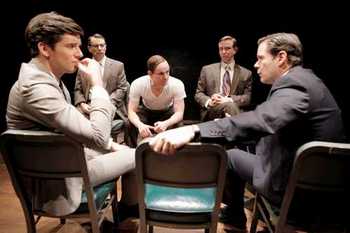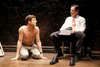 Though Marans has crafted a remarkably approachable and informative script, the success of both the play and this dynamic production cannot be attributed to one person. Director Jonathan Silverstein has smartly upscaled and rounded out the details of his earlier staging to make the work both more and less realistic. And though the show's two shooting stars, Thomas Jay Ryan and Michael Urie (from TV's Ugly Betty), are energetic and award worthy, so too is the ensemble (Arnie Burton, Matt Schneck, and Sam Breslin Wright) among the most varied and colorful you'll currently find in any currently running show. Were any of these elements not firing at 100 percent efficiency, chances are The Temperamentals would stall before even hitting the street. It should be too random, too scattershot, too obscure to work. The complex relationship between the closeted and married Harry Hay (Ryan) and the semi-out Rudi Gernreich (Urie), two of the founders of the more-than-borderline-Communist gay-rights Mattachine Society in the 1950s, shouldn't be robust enough to stay upright, given how much else is going on. The cornerstone legal case on which the Society turns and then spirals out of control, in which Dale Jennings (Wright) attempts to beat a solicitation rap by admitting to his homosexuality, is rather watery for a play's dramatic centerpiece. And you shouldn't care whether Harry, Rudi, and Dale, to say nothing of their eternally sparring partners Chuck Rowland and Bob Hull (Burton and Schneck), succeed in transforming attitudes decades before you know change actually took. Yet somehow the disparate pieces coalesce into a work that's not just sturdy, it's unshakable. Neither Marans nor Silverstein ever considers the society's success or failure a fait accompli. The insecurities, warts, and outright hostilities between the men aren't just ornamental, they're integral; how each new obstacle is overcome (or not) is something you can't easily anticipate ahead of time. Who will sell out, and why, you can't know until it happens. Equally surprising are the transformations - some to respectability, some from it - that outline the schisms and differences that reportedly still characterize the gay experience today. Perhaps most tantalizing is that it's not always - if ever - entirely possible to tell what's reality, what's informed speculation, and what's outright fantasy.