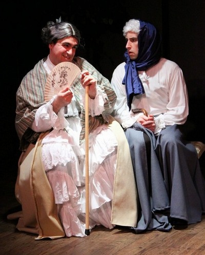 The 70-minute play, now at the Studio Theatre at Theatre Row, takes place long ago and far away at the villa of Signor Di Lirio (Branislav Tomich), a kindly man with a gentle heart, whose three daughters (Stephanie Nicole Kelley, Deanna Gibson, and Kerry Frances) are seeking his blessing to marry their suitors. Of course, there are a couple of roadblocks to get around first. One has to do with Signor Di Lirio's "gentle madness." He will make no decision until he consults with his wife—which is all well and good, except for the fact that she has been dead for three years, and, in his mind, is less than receptive to the wedding plans. The other roadblock has to do with the fact that the youngest daughter, Celia (Ms. Frances), has two suitors vying for her hand, the pompous Pomposa (Jackson Thompson) and the "most notorious scoundrel in town," Giovio (Nick Bombicino). Giovio is the requisite trickster character, and, as there is absolutely no doubt as to the final outcome, the ensuing fun lies in seeing how he will go about winning the day. The zaniest part of the play has to do with Giovio's scheme to introduce all of the suitors' mothers to Signor Di Lirio. There being no actual mothers at hand, he convinces the other beaux, who also include the bashful Timidio (Brandon Beilis) and the scholarly Serio (Evan Zimmerman), to dress up as women in order to persuade Signor Di Lirio to change his mind. The resulting meeting, with the men wearing silly getups and wigs (costumes by Jamie Nicole Larson), is an act that is both desperate and wildly comical. Mr. Thompson's character makes no effort to disguise his booming bass voice, and Mr. Zimmerman's character does a hilarious turn as an operatic diva, famous for her starring role in the classic "Forgetta Di Libretto." Even in his partial dotage, Signor Di Lirio is not persuaded by the ploy, so Giovio invents an even crazier scheme involving his "murder" by the other three. In the end, of course, all is set right, Pomposa bows out gracefully, and Signor Di Lirio gives his blessing. There is so much fun and joy in this production, under Kathleen Butler's skilled direction, that it is impossible not to fall under its spell. All of the actors perform with great comedic timing, though it is Mr. Bombicino's star turn as the rascally Giovio who shines most brightly by showing both the cleverness associated with such character types and a jovial approach that wins over everyone he encounters, even as he is manipulating them.