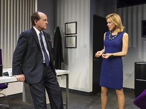 There are, admittedly, worse problems to have. Dee, who last exploded onto these shores (and at MTC, and at this theater) in 2000 with Alan Ayckbourn's Comic Potential, is the embodiment of applied energy as Linda, a London career woman who's discovered she can, in fact, have it all. In showing how Linda fits in at work as the senior brand manager for the skin care company Swan, she's a swaggering picture of confidence, in utter command of her audience, her product (an age-reversing face cream), and her industry. She's won awards for her marketing campaigns, but more than that, she's raised awareness and begun to change the world through viral campaigns that show little girls just who they can, and must, be. At home, she reigns no less supreme. Modulating her performance ever so slightly, and adopting a softer but equally intense view of her immediate surroundings, Dee transforms Linda into the uber-homemaker who knows her two daughters and her husband better than they know themselves, and runs such a tight ship that it seems to move under its own locomotion when she's not there. It's obvious how the professional ladder-climber and the personal conquering hero come from the same place, but not how she manages to make each apparently the only life she lives. Dee weaves exactly the magic that characterizes the most successful figures in business by making the unthinkable so natural that you can't imagine it any other way. It's all destined to go wrong, of course, and it does. Linda's boss, Dave (John C. Vennema), wants to court a much younger demographic, and has chosen the vapid marketing scheme of a 25-year-old upstart, Amy (Molly Griggs), to spearhead it. Outraged and ill as a result of this betrayal, Linda goes home to find another one: her husband Neil (Donald Sage Mackay) sleeping with Stevie (Meghann Fahy), a nubile member of the band he formed to deal with his midlife crisis. As Linda's perfect reality starts to crack from two sides at once, her sanity and resolve begin to melt into nothingness as well, and she must hold together what remnants she can if she's going to mend and rebuild them, and, hopefully, make them stronger. If anything, Dee gets even better when Linda is propelled into this mysterious new territory and must forge a path of the kind she was sure she was done with. It's heartbreaking, yes, but also inspirational, because you know that these are two women who will never, ever let you down.