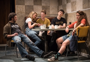 The play unfolds in the recollections and imagination of Adam (James Kautz), one of the left-behinds. Adam has been struggling for years with a hum of depression that has kept him anchored close to where he grew up in the New Jersey suburbs. As the play opens, we find him in the bedroom of his old home, rummaging through a box of paraphernalia from his teenage life. The year is 2004, and Adam is 30 years old. Before you can say "A Christmas Carol," a "ghost" from the past in the form of his old friend Tara (Rachel Franco) suddenly appears and whisks him back a dozen years to the old diner and his pals from high school. Suddenly everyone is 18 again, and the conversation is as free-flowing and random and trivial and important as any of us can remember it from back in the day. We don't need to understand the specifics in order to recognize the experience. Over the course of the play, we find out quite a bit about Tara and their friends Matt (Spencer Davis Milford), Hayley (Elizabeth Lail), and Pete (Sean Patrick Monahan), as they gather at the diner or a nearby playground, clinging to this special moment in time while smoking pot, drinking beer, and gingerly considering their futures. But even though Nibbler is Adam's story to tell, he himself remains an outsider, more comfortable reminiscing about his friends than he is of revealing very much about himself. While we do eventually learn about some of the specific events to which he attributes his deeply-felt angst (he speaks more than once about suicidal thoughts), they seem less like the keys to freeing him up than justifications for his failure to launch. As long as the play follows this particular pathway, it paints a more-or-less realistic portrait of Adam's struggles and of his efforts to use his stirred-up memories to come to some sort of epiphany about his life. But the playwright sidetracks us with two other plot lines, either of which might be better suited to a play of its own. In one, the teenagers are stalked by a creature from space, who nibbles on them (all but Adam, as it turns out) in a way that gives them wildly satisfying orgasms, while triggering a fast-forward in their sprint toward adulthood. As a result of their experience, for example, Matt and Hayley instantly turn into the J. Crew-wearing conservative Republicans they would have eventually become anyway. Yet another element introduces an outsider in the form of an older man, Officer Dan (Matthew Lawler), a model of arrested development who starts to hang out with the group, even taking up an affair with Tara. Also sprinkled into the mix is a song written by the playwright and some nudity and sexual situations. All and all, it's quite a mash-up. The performances under Benjamin Kamine's direction are well-delineated (James Kautz is especially effective as the unhappy Adam), but the play itself is too much of a jumbled skein of conflicting plots. Keep hold of the central strand, and you've got an interesting take on a coming-of-age story. Hang on to the "Officer Dan" thread, and you've got a potentially creepy tale about a stalker. Follow the space creature (the "Nibbler" of the title, represented through Stefano Brancato's excellent puppet design), and you've got the makings of a comic satire. The playwright says that this 90-minute version of the play began as a shorter one-act, a post 9/11 rumination on an earlier time when he felt more hopeful. The current production suggests that possibly the one-act was complete in itself. As it stands, Nibbler fails to coalesce into a unified whole. Instead, it hops about, as Tara puts it, like "imaginary conversations with people no longer in your life."