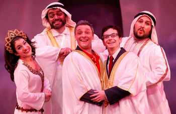Specifically, that peculiar dialect that's willing to do or say anything, provided no emotional honesty creeps into the proceedings. This alchemy can work, of courseThe Producers and Hairspray were little more than plastic-coated jokiness that somehow evinced some sense of substance. (For that matter, the Bob HopeBing Crosby Road to... movies, which at least partially inspired this musical's title, fit into a similar category.) But the creators must have the vision, commitment, and talent to make that imaginary world every bit as real as the one we live in. That Cole and Krane, who have plenty of major credits of their own (Cole The Night of the Hunter, seen at NYMF in 2006; and Krane arrangements for nearly 30 Broadway shows and the films of Chicago and Nine), haven't is why The Road to Qatar! is more dreary than delightful. The problems begin immediately, when the full five-person cast appears onstage, dressed in full-length Arab robes (the costumes, like the blank-canvas unit set and occasional puppets, are by Michael Bottari and Ronald Case). "This is a story about terrorists!", one bellows. No, corrects another: "This is a story about musical comedy!" After a tap dance (of course), they decide they're both right: "This is a story about musical comedy terrorists!" I'd love to say it gets better than that, but it doesn't. After we meet the heroes, "two short Jews," composer Jeffrey (Keith Gerchak) and librettist-lyricist Michael (James Beaman)no, Cole and Krane don't bother to use their real namesthe story is already in full swing. The musical's producer, Mansour (Bill Nolte), sweeps them off to Dubai for their first production meeting with him, and his comely assistant and translator Nazirah (Sarah Stiles), and the Emir's Ethel Mermanloving cousin Farid (Bruce Warren). During this meeting, Farid explains that the musical's plot must involve a sultan's son who is unable to leave the palace. "But why?", asks Michael. Nazirah "translates" by screaming the dictum again at the top of her lungs. When Michael presses still further, she repeats even louder, this time pantomiming and squirming around on the floor like a petulant child just told there's no more ice cream. Having fun yet? From the production meetings (the Arabs naturally hate the entire first draft) to the recording sessions in Bratislava to opening night of the desert-filling spectacle (which we see far too little of to follow), everything in the show is filled with this kind of frying-pan-to-the-head humor. It's all delivered as though every actor is trying to project to the third balcony of a theater five blocks away. The billed director is Phillip George, but beyond the likelihood of "Loudest! Fastest! Funniest!", there's no wit and creativity in the staging to suggest what exactly he directed anyone to do. The problem isn't just that this drive-by-shooting style of writing and presentation prohibits legitimate comedythough it doesbut that it prevents The Road to Qatar! from attaining the warm intimacy that would best suit it. Nothing could save most of the songsFarid's paean to musicals is as dreadful as it is predictable; "Good Things Come in Threes," "Give em What They Want," and the rest of the "writing" songs are instantly forgettable; "Nazirah's in London" has an undulating melody, but is an unnecessary crowning moment for someone who's barely a characterbut the story of two writers who meet each other and become trusted colleagues and friends under such bizarre circumstances should inspire jokes, lines, and scenes rife with hope, fear, and wonder. None of these qualities is present, even momentarily. What you get are a lot of gay jokes (including a leotard-wearing choreographer-director-designer) and Jew Jokes, but no recognizable feelings or scope that may paint Michael and Jeffrey's experience as the once-in-a-millennium adventure it is. The singing, against David Caldwell's charming five-man mini-orchestra, is roundly expert. But the performers can't (and don't) create compelling characters in a world this bleeding-Technicolor. It's all blatant and blaring, but lifeless, crying out for the subtlety and variety that even a one-sentence plot synopsis would apparently demand. The evening's sole moment of respite comes with the musical-within-the-musical's title number, "Aspire" (actually written for the original show). Armed with the requirement that the song simply must contain 10 uses of that word, Michael and Jeffrey craft an inspiring song of such bouncy tunefulness, it will echo in your head for days after you hear it. (It certainly has mine.) "You gotta be big / You gotta be brave / You gotta aspire," the lyrics run. "You gotta reach up / You gotta reach out / You gotta reach higher." The song's creation marks a turning point for Michael and Jeffrey's show and relationship, as well as a reminder that lasting success only comes from pushing yourself beyond others' limited expectations. How much better The Road to Qatar! would have been had Cole and Krane bothered to follow their own advice.