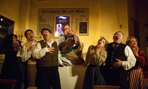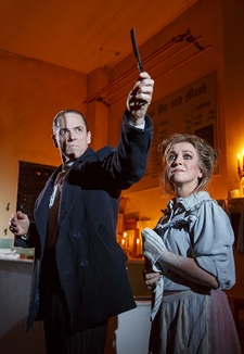 This "pie and mash" concept is held over from this production's first incarnation at the actual Harrington's Pie and Mash Shop in London, where it ran in 2014 before packing up its pastry for a West End run. The buzz going into the New York run was, as you might expect, whether the production is good enough to warrant the fuss, or if the rave reviews ought to be saved for the pie. Well, the pie is indeed terrific. And I'm happy to report that a significant chunk of the show itself is even better. With the Barrow Street so compressed into a hole-in-the-wall restaurant (Simon Kenny designed the set as well as the costumes, and Amy Mae did the lights), there's no escaping any part of this tale of the villainous barber of the title, the daft baker Mrs. Lovett who becomes his partner in crime (by finding a creative way to dispose of the corpses he creates on his quest for vengeance), and the various romantic, class-defying, and tragic consequences that ensue. Although you're seated at benches and banquets with, in most cases, tables immediately in front of you, director Bill Buckhurst has found an astonishing number of ways to work you and your neighboring diners into the story. Sometimes it's as little as a glance, sometimes it's a more intense glare, sometimes it borders on manhandling. (If you're a follicly challenged gentleman, you don't want to sit on an aisle. Trust me on this.) In every case in the first act, though, these instancesand, for that matter, the close proximity to the Grand Guignol grotesques who comprise the dramatis personaewrench you right into the action, with incredibly little effort. Yes, the compositions are among Sondheim's best and most operatic, thrilling in their height and breadth as well as their emotional acuity, and that's not lost. But the actors imbue it with that extra, pulsating spark of life that can sometimes get lost within this show's imposing scope. Though none of them plays to a far-distant balcony, their performances are as glorious in their enormity as they are theatrical and, most important, honest. Buckhurst knows what any good director does: that you can mine the script and score for plenty of terror and psychological complexity without needing to force a shopworn gimmick on top of it.