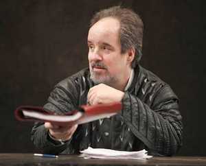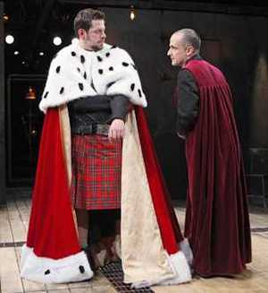 Or, to put it in the terms the play itself uses, Equivocation is "how to speak the truth in difficult times." That's the trouble that Shakespeare himself, known here as Shag and played with a keen dry bluster by John Pankow, is having with his latest commission. He's been tasked by King James I, or rather his Prime Minister, Sir Robert Cecil (David Pittu), with writing a "true history" of the recently foiled Gunpowder Plot, from a manuscript provided by the King himself. But the work, lacking detail and nuance but stuffed with propaganda, does not make an elegant stage play. So what's a working stiff like Shag to do? Ah, there's the rub - and the nub of this fascinating glimpse at the inspiration of inspiration. Shag is under constant assault from the other members of his playing company, The King's Men, to meet their financial obligations, sort out their personal squabblings (the aging Richard Burbage, played by Michael Countryman, is constantly at odds with the young and handsome Richard Sharpe, played by David Furr), and turn out something theatrically fulfilling. (The "experimental" Lear just isn't cutting it.) That Shag is still tortured by the death of his son, and of having to deal with the daughter (Judith, played by Charlotte Parry), he's never been able to relate to, does not help. Cain does have the typical bit of fun with playing from his future vantage point ("I believe your plays will still be being done," Cecil muses at one point, "50 years from now"). But for the most part, he's woven together a deeply compelling story that works not only as a chronicle of the creation of an unknown play and one of The Bard's most famous, but also as a critique of the individual's responsibility in an infinitely politicized world. The colliding personalities of the King's Men, who also include a delightful Remy Auberjonois as the token (and improbably bearded) boy player, present several different facets of this, with the pragmatists, the capitalists, and the artists all having their say. But more central still is Shag's attempts to bring balance and detail to his Gunpowder Plot play by interviewing its participants. This thrusts him into the conflict for reasons he doesn't expect and can't always cope with, but draw out of him the commitment and cleverness both he and Cain need to tell one must-hear story under an avalanche of must-not-hear conditions. Admittedly, the interviews and their (usually bloody) aftermaths are not as interesting as the way Shag and his cohorts deal with what they learn. This does slow down several chunks of the play, especially in the second act, and veers ever-so-slightly into the pretentiousness that Cain otherwise so skillfully avoids. But the shape of the action, showing how Shag evolves from a one-dimensional creative into a more all-encompassing human being because of the atrocities he witnesses and must write about, is as exact and involving as can be. The climactic scene in which the final product is performed, with all the characters reflecting (whether from the stage or the audience) on its immediate significance to them, is a cunning and captivating collage illustrating the real ways in which theatre can (or sometimes can't) transform its witnesses. And Judith's final soliloquy, musing on the personal and perennial impact of her father's work, is a legitimately touching analysis of a man who - in spite of everything else - was a father, too. Perhaps the greatest accomplishment of both the play and this production is that they organize all of this - and more - into a completely cohesive work. Director Garry Hynes has emphatically staged the show on a Globe TheatremeetsSt. Ann's Warehouse set (by Francis O'Connor, who also did the modern-dress-with-ancient-accessories costumes) that locates the action in the center of a time warp, but feels unerringly right from start to finish. David Weiner's lights are instrumental in further defining in what location and under what circumstances events are taking place, and gracefully ushering scenes from light-footed comedy to gash-inducing tragedy and back again.