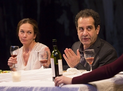Even after she's done so, however, this is a pretty empty evening that doesn't earn its length of nearly two and a half hours. Doran and her director, Sam Gold, score in the opening scene, in which Charlotte and Jonny throw a dorm-room dinner party for Howard and Lucinda. In addition to revealing just how off-track the younger characters are in terms of caring for themselves and potentially each other, it also shows, with deft comic flourishes, the uneasy give-and-take of personalities and beliefs between Charlotte and her parents: traditionalism failing to mesh with now-prevalent just-do-it attitudes. What happens after this scene, however, is little more than a series of shocks that keeps upending the dramatic tables without lingering long enough for us or the story to absorb the changes. The twists are plentiful, perhaps too much so; there's no way to be surprised by most of what happens, as, after a while, you just come to accept that in another ten minutes you'll see something even zanier. The second act, which digs deeper into the characters, fares better, and becomes more identifiably and relatably human as it examines the outcomes of these constant sexual split decisions. But because a fair amount of the action is also driven by characters we don't meet (primarily two love interests each for Charlotte and Jonny), the concerns seem less real than they do theatrically manufactured, the extent of the emotional havoc wreaked is never as clear as it needs to be. Gold, though usually wonderful at helping actors elicit powerful performances through understatement, is off his game here, likely because nothing, except Andrew Lieberman's uninviting sunroom-meets-shadowy-curtain set, about The Mystery of Love & Sex is understated. Doran's sweeping plot shifts and contrivances require bold acting, and only Lane is working on that wavelength. She's at once big and internal, making Lucinda's ridiculous yoga hand gestures and placating speech patterns the ideal defense mechanisms for a woman who's never been allowed to be herself. After events give Lucinda more freedom, Lane blossoms into full, sympathetic vivacity: a complete woman who revels in the chains she's been able to throw off, and Lane is a pure delight as she makes the journey. Shalhoub is only marginally less successful at working through Harold's complications, and though he's funny in hypercritical mode (when he sees a dish of salad or a piece of butterless bread as a spiritual affront), his forays into dealing with the serious charges of Howard's discriminatory writing are less believable. You want to see both points of view about him, but Shalhoub's approach is too innocent to sell them as equal possibilities. Similarly afflicted are Rankin and Athie, who come across as perfectly friendly but don't convince as confused souls at a crossroads. That's what everyone here is, in one way or another, and if Doran does make that point, it's only one she hits home. How the decisions made and avoided at each juncture transform lives is what will captivate and move us, even if only to laughter, but in the end we see the psychology of the playwright more than that of her characters, and that's not satisfying. The workings of the heart may be complex, and we may indeed be better off giving up and giving in to it. But the lack of insight ensures that, by its end, The Mystery of Love & Sex remains, at best, a mystery, too.