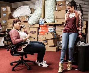 Here the setting is not the factory of Nottage's and Morisseau's plays, however, but a copy-and-shipping shop in Harlem. The title, Dolphins and Sharks, refers to a life science course one of the characters is taking, but it also serves as an apt metaphor for the "shark tank" in which all of them are forced to swim. The focus is on a group of workers who scrimp, connive, and hustle in order to get by on their unconscionably meager wages. They lack the skills or credentials that will lead them to a better life, and they find themselves ensnared in low-salary jobs under the thumb of a penny-pinching boss who constantly demands more, pays less, and threatens cutbacks at every turn. In brief, they inhabit a universe where, as one of them puts it, what you want takes a distant back burner to "what you gotta do" in order to survive. Within the copy shop (perfectly rendered by Marsha Ginsberg's detailed set design), the African American and Latino employees try to maintain a pleasant work environment despite growing stresses of office politics, equipment that keeps breaking down, and an off-site white owner who is squeezing the life out of them. Things come to a head when one of the workers, Xiomara (Flor De Liz Perez), is made manager, a position for which, it turns out, she is ill equipped. Although Xiomara has been friendly with everyone, especially with the ebullient Isabel (Pernell Walker), she lacks the personnel skills to live up to her repeated promise to "look out for everybody" once she gets the promotion. Instead, she quickly falls into the trap of being the eyes, ears, and mouthpiece for their boss. Suddenly there are new job requirements, policies regarding lateness, a dress code, and a time clock for punching in and out. Even the TV in a corner no longer shows such distracting fare as Judge Judy and The Price Is Right to give the customers something to look at while waiting for their copies, but merely displays the company's logo. In this new environment, everything changes. The custodian, Danilo (Cesar J. Rosado) is fired, and Isabel and another worker, Yusuf (Chinaza Uche), are now expected to clean the bathroom as part of their daily end-of-day closing routine. Xiomara is constantly harping at Isabel regarding her outspokenness and her friendliness with the customers. And Yusuf, a college graduate who has little to show for it but enormous debts, turns from a nerdy doofus into an angry young man when Xiomara keeps putting off his pleas to be paid the salary he'd been promised instead of the much lower amount he has been receiving. Quitting is out of the question for any of them; the job market for the underskilled and the underqualified is non-existent. A real strength of the play lies in the way that the atmosphere changes gradually. The often very funny friendly bantering in the first half of the play devolves later into an ugly series of angry interactions involving race and gender. Xiomara feels she is being dissed because she is female and Latina. Isabel feels she was overlooked for the manager's position because she is African American and overweight. Yusuf and Isabel butt heads over the fact that he is Nigerian and comes from a well-to-do family and therefore, at least in her eyes, he does not understand the lives of the established black residents of Harlem. Also adding to their fraying nerves is a regular customer, Amenze Amen (Tina Fabrique), who uses the shop as her personal office, tying up the computers and manipulating her way into getting free copies of flyers aimed at organizing the community to battle the neighborhood's history-demolishing gentrification. Charlotte Brathwaite directs all of this with the precision of a choreographer, and the supportive production elements (lighting, sound, costumes, video projections) add their own rich layers to the work. Given the play's socio-cultural themes, it is a great tribute to the playwright and to the cast that everyone "keeps it real," with performances that are completely character-driven. We never lose sight of the individuals involved, and as the play progresses we get to know everyone's story, each of them trying to get by and avoid being eaten by the sharks. In the end, it is Amenze Amen, the community organizer, who urges everyone (including the audience) to stop fighting each other and to collectively take up the tougher challenge. "The system is not working for everyone," she says. "Are you going to accept this?" Something to ponder as you head home from this powerful play by a rising star of a writer.