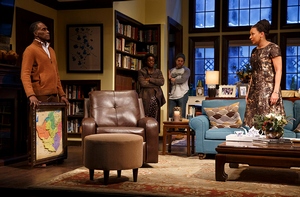 Under the direction of Rebecca Taichman, this all moves with a lively fluidity, the serious issues underlying the rather frivolous plot emerging gently but potently as it becomes increasingly clear that Tendi and Chris are not getting exactly what they bargained for. The performances are roundly winning, with Tunie's sobering, stalwart bellwether of a Marvelous a fine central focus point that never comes across as more than a woman trying to do her best without all the tools she needs to succeed. Surratt, both more openly warmhearted and lower-key, contrasts her beautifully as an underdog waiting for his ideal opportunity to take charge. Aghayere and Ruff draw sharp, stark outlines around their characters as the two opposing sides of the second-generation American coin, while Nicholls-King and Taylor boldly balance out the uncompromising Marvelous. Though Earle and Tippett are locked in the least-interesting roles, they do quite a bit to make Chris and Brad at once comic and complex. All of this, however, occurs before intermission. In Act II, Gurira all but abandons the creative understatement that defines the first act and relies on corny dramatic devices, cliché after hoary cliché, and, worst of all, completely scrambling her characters' brains to nudge her story from tiny to expansive. You must accept, for example, that Tendi can and will go from "God-fearing Jesus lover" to "heathen libertine" in one second flat, complete with the requisite swear words that she previously claimed deeply offended her; that Donald harbors feelings and desires far in excess of what his Act I personality suggests; and that all these smart, open, thoughtful characters would intentionally hold life-changing information from someone else for reasons that are spurious at best and unbelievable at worst. Gurira's intent is obviously to upend the tropes she previously tweaked, and though that's not an original idea, it's hardly a bad one. But by going as far, as recklessly, as she does, she transforms a lovely, sincere piece about the long-lasting difficulties of assimilation into one that is rustily mechanical and stunningly emotionally false. I didn't buy any of the late-entry, whiplash-inducing turnarounds (including the most plausible of the lot, a quirky flirtation between two people who develop an unusual bond during the roora), and I was in everyone's corner going into the final stretch. Though Gurira somewhat redeems herself with the final scene, which reignites the play's essential themes, no one emerges totally unscathed except for the designers. Clint Ramos (set), Susan Hilferty (costumes), and Tyler Micoleau (lights) have committed themselves to an unflinching suburban realism (aside from Anne's elaborate, colorful clothing, that is, but it's right for her) that leaves no mystery as to the blatantly ordinary circumstances under which this play unfolds. By departing from the actual, even with the aim of capturing some concrete truth, she allows her spin on a classic genre to lose its flavor and savor and become far too familiar for its own good.