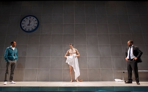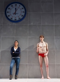 It's a bit of a jumble of content for a 90-minute play, and neither Hnath nor his director, Lileana Blain-Cruz, quite make it cohere. Aside from a pitch-perfect physical production (the institutional-gymnasium set is by Riccardo Hernandez, the slickly icky lighting by Yi Zhao, the cavernous sound by Matt Tierney, and the costumesincluding the scant title number, which is about all Breaux wearsby Montana Blanco), what you get instead are moments of intensity and insight, especially when Ray must, in turn, confront the three people who have affected him most on their own terms, separated by literal and figurative splashes that douse what sparks are generated. A last-minute fight between two characters, despite its bloody ferocity, has difficulty believably capturing the rage and agony that are simmering under its participants' surfaces. It's as if Hnath wanted to end with a bang, but neglected the finer points of the buildup that would make it truly hit home. Part of the problem may be that one of Red Speedo's greatest strengths also turns out to be a considerable weakness. Hnath has penned crisply clipped dialogue that has the right sound and feel for four people are always on the go go go, and it's exciting to listen to, but it may be too realistic to dig sufficiently deep in the absence of a richer story. Only in Lydia's case does it create a full-bodied human being, and it does so then probably only because she appears in but one fairly short, straightforward scene. Otherwise you get a lot of broad strokes that verge dangerously on caricaturedown to his guy-next-door dumbness, Ray is all but the spitting image of Ryan Lochte, for example, and is otherwise not freshly conceivedand shock-driven staging from Blain-Cruz that imparts an unconvincing urgency. Breaux does what he can, but Ray just isn't that compelling: You learn most everything you need to know about him in the opening scene, and then watch the actor plod through the motions of unraveling the mostly flat consequences while wearing an almost hypnotically blank stare throughout. (It definitely signals Ray's singular focus, but perhaps does so too well.) Rooney gives a meaty portrayal of an ordinary dreamer teetering on vicarious glory, and never oversells Peter's percolating desperation, which makes him seem stronger and scarier than you'd expect at first glance. Lydia gets the forceful rendering she deserves with Winters's intricate, take-no-prisoners approach, and the slow-burn devotion Fernandez brings to the coach nicely rounds out a fairly thin figure. Red Speedo as a whole, though, needs the same kind of treatment. Like The Christians (which was set against the backdrop of an evangelical Church service), it seeks to fuse its plot with its presentation. But the lack of firm natural connections between the two and the bad choices that are presented as the only options give you less to gnaw on than you need to feel nourished about these issues. For all the Big Questions the play and its characters have on their minds, as refracted through that water and sanitized by the chlorine, they end up small, soggy, and sterile.