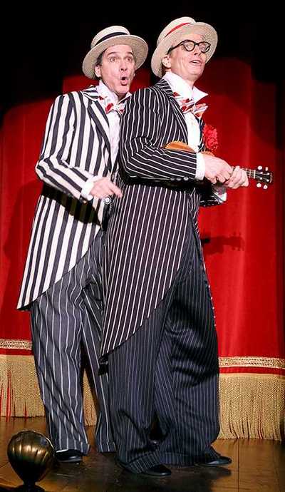 And drive they do, as though blazing down the German autobahn. The opening image of Tina Landau's production says it all, showing the men zooming through space and tunnels that resemble what a subway might look like in the Tron universe: all psychedelic angles and guttering lights with which no one, not even these two fleetest-of-foot performers, could possibly remain upright. The painful reality is rendered moments later when all the technological filigree vanishes in an instant, the future dissolving into something more obviously the pasta locale from which neither they nor you will be allowed to escape for the next two hours. That's okay. The past, after all, is when the human body was the world's greatest innovation, and it's impossible to imagine a more natural home for Irwin and Shiner. And as soon as they've arrived, they have no trouble making themselves at home. Within short order, they're aspiring politicians struggling to one-up each other during a debate. Now one is a businessman whose electronic devices are developing minds of their own (all right, this is 1905 with a few forward-thinking touches); and the other is a hobo who finds romance in what is, for him, the only logical place: pieces of trash he sadly fashions into a dear, but temporary, friend. Next they're a ramshackle husband-and-wife magic team, a pair of bickering septuagenarians waiting for a train, then a couple of hoofers vying for the attention of their encouraging pianist and giving in to the long-forbidden pleasure of (gasp) speaking and even singing onstage. There is, at first, a particular poignancy to that last bit, as it suggests that even this duo's art is something that can eventually be replaced. (Though, fret not, they learn the virtues of silence again before they're through.) But if every other sketch similarly hints at the horrors of obsolescence, none of them leaves you believing that Irwin and Shiner should themselves be put out to pasture. No, they're refined spirits now, who inject a more palpable sadness and sense of loss into their work that makes their bits just as reflective as they are funny. And if the men's physicality is perhaps more tentative than once it was, they leave you secure in the notion that they have ability and energy in reserve well beyond what they're deigning to reveal. They give you no reason to doubt that they could rewrite the history of the world on their own. The old hats of Old Hats, then, don't need any additional helpyet they receive it anyway. It comes courtesy of Nellie McKay and her band, who fill in the spaces between the scenes with songs likewise revolving around the theme of personal or social uselessness. One for example, is about the pleasures and pain of drifting through life, another about a woman who can apparently do better than find romance in (and, uh, perhaps with) a bodega, yet a third tweaking certain visions of feminism (with a clumsy shout-out to Michele Bachmann at the end). In isolation, there's nothing wrong with any of these numbers, or McKay's preĀsecond act promenade through the house, improvising new tunes and lyrics based on everything she observes or even momentarily considers. But so many such additions (there are seven full-length numbers), which receive so little participation from the ostensible stars, quickly spoil the flow and flavor of the proceedings and keep you from getting lost in whimsy. Though any vaudeville homage this direct would demand music of some kind, for the ploy to work the songs would either need to be shorter of length or longer of variety. McKay's sophisticated drone-whine becomes weary quickly, and without a theatricality equivalent to that of the jokers onstage it seems more of an intrusion than an elucidation. For her part, Landau has apparently not entirely decided whether this is supposed to be a rebirth of a moribund form or an elaborate comment on it. If the former, G.W. Mercier's classically minded sets and costumes are forever at war with Peter Kaczorowski's lights and Wendall K. Harrington's projections; if the latter, the resurrection of the men's classic scenarios (Irwin fighting a plate of spaghetti, Shiner directing a silent film with audience actors) interferes, and in any event no point beyond the resiliency of the practitioners is ever made. If there were nothing more to the evening than its clowns, that would not be a problem. But, as executed here, they're just two cogs in a much larger machine. At least they're hard-working cogs, and you never tire of seeing the wonders perform when they're left alone to do what they've always done best. The biggest flaw of Old Hats is that not enough people involved have seen that they can, and should, leave Irwin and Shiner alone far more often than they do.