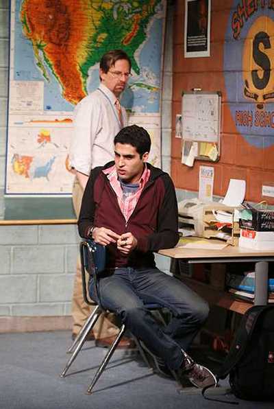 Joseph is perhaps best known for his Pulitzer Prize finalist Bengal Tiger at the Baghdad Zoo, but has spent much of the last decade composing a catalog of works chronicling young people's fights against the world, their families, and themselves. So when, at the start of this evening, which has been directed by Giovanna Sardelli, he ushers us into the vice principal's office at a crowded high school in the late afternoon on the last day of classes before Spring Break, the thing we're most anticipating is fireworks. For a while, it seems like we're certain to get them. Dr. Danielson (Stephen Barker Turner) has summoned a student, Khadim (Babak Tafti), to see him before leaving for the weekand it's not immediately clear why. Khadim isn't getting poor grades (he has a B average), and he's not proven himself a troublemaker in the months since his transfer. There's just the hint of a problem: Khadim's apparently having gone home after a recent fire drill that occurred during the final period of the day. But surely that's not a punishable offense? Perhaps not. But as Danielson lays and springs an increasingly complex series of traps, holes begin developing in Khadim's story about both that day and his life. Was he even in class that day at all? If not, where was he? What has he been doing in the basement, where only his locker (out of some 3,000 in the school) is located? Why have his parents been out of the country, in Saudia Arabia, for a month, and what is he doing alone at home while they're gone? Why was he kicked out of an elite private academy? And what connection, if any, did he have with a "troubled girl" named Lia Winston, who committed suicide earlier in the term? All of these questions are, of course, interconnected, and by the end of the 90-minute play, we've learned exactly who Khadim is and why he's not just a threat to Danielson, but more like the middle-aged man than either might like to admit. Joseph does not have any particular trouble navigating the intricate plot and its myriad deceptions, which at various points involve everything from parrots to cell phones to PVC piping to an underground bomb shelter located on campus (the slang term for which serves as the work's title). But if Joseph has provided an intriguing basic foundation, his attempts to build it out are usually half-hearted and even more frequently boring. None of the answers to the mysteries surrounding Khadim are explosive, and at their best most of them are contrived and casual. Worse, the stakes for both men are shockingly low. It takes us far too long to discover what drives either man, and the tension between them crackles so little that even when they discover what they have in common, your reaction is less likely to be "ah ha" than "about time." The nervously driving nature of Dr. Danielson and the brusque, aloof attitude Khadim demonstrates in return don't leave much room for good performances. Even so, Turner is shrill in presenting Danielson's quest for the truth, and never varies either his vocal cadences (medium bitter) or his emotional intensity (marginal) as circumstances ought to dictate. Tafti is slightly better, but he lets Khadim remain so soulless for so long that when he eventually warms up, you can't completely accept the transformation. Though Donyale Werle's office set is just as cramped and institutional as it should be, Sardelli doesn't make much use of it, and her staging is inert and less than inventive throughout. Not that she's been given many opportunities. Despite having a few genuine points to make about prejudice and secrecy in war time, and gently portraying this event as a caution-inspiring microcosm of the recent Iraq war, Rajiv hasn't given her the freedom she needs. As with his characters here, he's boxed her in by trying to pretend we're watching two fearsome beasts when they're able to summon up few feelings stronger than indifference.