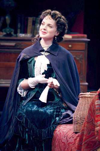 From the instant she appears halfway through the first act of the production, which has been directed and designed by Tony Walton, she lives up to exactly the precepts Shaw himself laid down. "Well built, well nourished," he described her, with "serene brow, courageous eyes, and well set mouth and chin [that] signify largeness of mind and dignity of character." It's vital that you see and believe all that about Candida from the outset, for so much of her character is defined by what her husband Morell (CiarĂ¡n O'Reilly) and the adoring, considerably younger poet Marchbanks (Sam Underwood) say about her - she must have her say even before she can get one word out. And Errico does. Bustled and girdled up tightly but with no hint of matronliness, she moves with the intense intention of a woman who knows the rules and limitations society has imposed on her. As the silent controlling partner in Morell's existence as a clergyman and professional preacher, she must manipulate things from the shadows while standing in the light. Errico's crisp line delivery and vaguely shadowy (or at least suspicious) affectionate glowers suggest from the beginning that Candida knows her role and is playing it to perfection, and won't let anyone dictate otherwise. This, of course, helps out tremendously when Morell and Marchbanks force the show to become exactly that as they vie for the affections they think can only be accorded one of them. But if Errico fulfills her end of the bargain, the others aren't quite so giving. The face-off between O'Reilly's highly aloof and dispassionate Morell and Underwood's jittery Marchbanks does not exactly steep the play in tension; you never doubt whom Candida will eventually choose, even if the reasons she describes are not the ones O'Reilly and Underwood present. Neither actor makes a sufficiently advanced case for his character's claim, which makes their continual jostling through much of Act II and all of Act III a bit underwhelming. That Underwood never seems to delight, or believe in, the hackneyed verse that should fully define Marchbanks (he's 18, Candida is 33), only exacerbates the problem. Further imbalance is found in the supporting performers, with Josh Grisetti too obviously pandering as Morell's hot-blooded but cold-talented young colleague and Xanthe Elbrick as the pent-up typist who typifies - but can't herself understand - the precise reasons men will always prefer Candida over her. Brian Murray brings his typical blustery verve to Candida's father, Mr. Burgess, which is unquestionably amusing but a bit off-kilter for a man who should both present a solid third alternative to the two men warring over his daughter and prove where she got her pluck. Walton's cramped but homey sitting-room set and colorful but unexcitingly Victorian costumes are just right for filling out the visuals. But both his staging and his character work would benefit from a deeper, grander treatment rather than one that just skirts the surface of the issues of religion, socialism, and marital obligation that are the heart of one of Shaw's more uncharacteristically romantic and passionate works. Errico embodies both those traits and a lot more, in a performance that, whether it's centering on coddling Morell, chastising Marchbanks, or even just basking in the glow of semi-hypnosis while lying on a chaise and playing with a fireplace poker. She looks, sounds, and behaves exactly like what Candida must: a woman every man wants and that every woman wants to be. But, ultimately, she belongs to herself and will make her own choices. Walton's Candida would be better if every other character could marshal that same kind of theatrical independence.