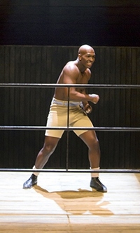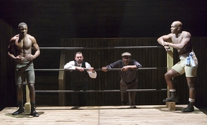 Scenic designer Nick Vaughan and lighting designer Austin R. Smith, who illuminates the stage with an imposing, cavelike persistence, are responsible for the choice visuals that propel you through this lean-and-hungry, blood-pumping 80-minute evening. (The fine costumes, just as atmospheric, are by Dede M. Ayite.) But Ramirez and his director, Rachel Chavkin, extend all that same electricity to the script and its presentation as they spin the story of Jay Jackson (who's played, with magnetic gusto, by Khris Davis). This black boxer in 1905 (who is based, none too subtly, on the real-life Jack Johnson) is on the cusp of greatness, and no one lets you forget it. The staccato, almost pointillist script uses sharp jabs of individual words and dialogue that are punctuated by constant claps and pounds from the five-person cast to mimic, with eerie effectiveness, how each physical and verbal blow landswith breath-robbing force. It's a vividly theatrical solution that lets them cover more ground (and, in my book, more thrillingly) than, say, the climactic bout from Broadway's Rocky two years ago. It also wrenches you back into a period when all of this was of questionable legality (if not morality), an implication that proves crucial Jay rises to the top of his chosen profession. Backed by his coach Wynton (Clarke Peters), his sparring partner Fish (McKinley Belcher III), and, to a lesser degree, the fight promoter Max (John Lavelle), he becomes the Negro Heavyweight Champion of the World. But that isn't enough: He wants to prove even more, by tackling the actual Heavyweight Champion, the white Bernard Bixby, who's retired but willing to put on the show of retaining his titleif the price is right. Much of the action is consumed with Jay preparing, mentally and bodily, for the Big Fight, but Ramirez is far more interested in the personal and social psychology behind his yearn to win. Jay is both driven and held back by his lovely sister, Nina (Montego Glover), who sees Jay's ambition as yet another trap that's preventing him from living an honest, clean life. Not only must Jay fight her (metaphorically speaking), but he must also take on the white power structurea group that, unfortunately, coincides with wrestling ticket buyersand risk setting off a race war if he pummels Bixby the way he's sure he can. And, either way, Bixby only agrees if Jay turns over 90 percent of the receipts. For Jay, what is really losing and what is really winning?