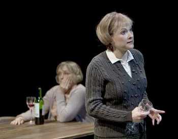 Cromer doesn't stop there. As the people and problems keep piling up, he makes full use of both Korins's dual revolving stages and the geometry of entrances and exits to ensure that you never miss a single emotion as they echo down the decades. He utilizes more haunting - and distinct - combinations of characters and actors than you may think possible to present what feels like no fewer than three points of view in any given scene. When the younger and older versions of the women are present at the same time (they almost never interact directly), you're equally absorbed in both. On the rare occasions everyone is onstage together, it seems like there are far more than merely nine stories and nine personalities uniting under umbrellas both figurative and factual. Credit is, of course, strongly due to many of the actors. Hurt and Clark dominate primarily because of their larger chunks of stage time, but they gracefully embody two stirringly contrasting views of modern womanhood: Hurt is all curt smoke and vague disdain as someone who suppresses her pain and passes it down to her descendants; Clark performs a beautifully calculated slow erosion as Gabrielle's pain eats her alive. Blumberg and Pourfar are flawless mirrors as their younger selves; their unassailably faithful looks, mannerisms, and voices define exactly how this most theatrical of devices should always be executed. Topol is quite convincing as a husband with a devastating secret, all stiff-shoulder detachment and eyes that look beyond whoever is before them - not out of fascination, but embarrassment. McLachlan makes one of the play's most put-upon victims truly sympathetic, both low-key as a nice contrast for Clark's (necessary) histrionics and tortured as proof of the impact unrequited mourning can have on otherwise innocent onlookers. Rogers and Vick are decent in their rather colorless roles; Siberry only comes into his own in the final scene, when wrapping up the plot is the order of the day. But even that obligatory moment becomes special in Cromer's treatment, which floods the stage with feeling despite the fact that most of the performers onstage don't speak a word. Though the dialogue is garden-variety wrap-up stuff that explicitly spells out the relationships Bovell had rockily established in the preceding 100 minutes, Cromer bestows it with the sheen of a first-ever family reunion, defined as much by the warmth of kin as the uneasiness that can isolate strangers. It's an intoxicating moment of sunshine, and desperately needed at the crowning moment of When the Rain Stops Falling, a play that before that point often seems all wet.