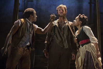 Where Wallace distinguishes herself and her play is with the nature of these bonds. On the surface, Dembi (Ito Aghayere) and Adjua (Kristolyn Lloyd) would seem to be an average couple who've built a comfortable living on the docks of Bristol by the time we first meet them in 1791, and are longing to soon start a family. They're so in sync, and so committed to their "bad boy" and "good girl" images, that no one would suspectindeed, no one would even have reason to suspectthat they're not just escaped slaves who have made good but are also, in fact, both women. Dembi hides her truth beneath a convincing masculine façade, but is haunted by what she wants but can't have. A ghost chases Adjua as well, but it's that of her sister, who drowned after being thrown overboard from a slave ship, and she's consumed with rage and desire for revenge against the captain who gave the order. So when they learn that the white man who's recently washed up in their midst, Cranston (Michael Izquierdo), has a connection to that ship, things, shall we say, become a bit stormy. Considering that Cranston has lost much of his memory, his role in what happened is left an open question for some time. His feelings for Adjua are more pronounced, and he's both determined and willing to take what he wants from her. This is an attitude that not only has major implications later, but reminds how blurry concepts of "right" and "wrong" become when the matter of treating people as property is accepted as a giventhe closest The Liquid Plain gets to a single, declarative theme statement. We don't meet the third woman, Bristol (Lisagay Hamilton), until the second act, set in 1837, when she sets out to unravel the murky fates of Dembi and Adjua. She's been no more able than they to move beyond the circumstances of her own birth, which are tied to a ship and crew that were devoted to rescuing slaves, and parents who were not what she always believed they were. Before long, it becomes evident that true absolutionand forgiveness?can come once Bristol gets what she wants and arrives where she's always been heading. Though it's quite dark, The Liquid Plain never wallows in unhappiness. Wallace injects some levity and poetrythe title derives from a Phillis Wheatley poem, but William Blake is commonly cited and shows up as a figment of one drunken reverieto keep the action buoyant and the tone reminiscent of August Wilson's brand of accessible import. The fierce forthrightness of Dembi and Bristol further brands the overall work as one of action and hope, not merely making the best of the bad lot, and the scenes that focus most on how they use their unique skills to shift their worlds are by far the play's strongest. The connective tissue, alas, is much weaker. Certain subplots and large chunks of characters rely pretty strongly on coincidence for a story that's all about taking responsibility for yourself. The writing for most of the subsidiary mendock scum Balthazar (Karl Miller), pilot Liverpool Joe (Johnny Ramey), two ancient men (Lance Roberts and Tuck Milligan) who briefly cross paths with Dembiis sketchy and distractingly light, as though it was piped in from a Technicolor historical drama. And Wallace's efforts to fuse gritty reality with the gauziness of memory and imagination only occasionally catch fire, their heavy symbolism dampening the potential impact of realizing how thin the boundaries between the brain, heart, and spirit really are. Director Kwame Kwei-Armah's staging of many of these moments tends toward the scattered and confusing, which doesn't help, though his direction of the dock scenes shimmers with the proper rough-hewn emotional authenticity. Paul Tazewell's costumes and Thom Weaver's lights are spot on, as for the most part is Rocco Hernandez's imposing wooden dreamscape set, though it provides a too-cluttered backdrop for Alex Koch's mood-setting projections to truly hit home. The acting, however, is engrossing, at least from the leads, all of whom channel their characters' innate anger in different but compelling ways. Aghayere tempers hers with romance to create a cruelly complicated (and compelling) Dembi who's as naturally likely to rip something apart as grip it with all her might. The sense of hollowed-out anguish is palpable from Lloyd, who shows how Adjua's optimism is both her best feature and the trait most likely to undo her. In highlighting Cranston's many imperfections and contradictions, Izquierdo sculpts a dynamic portrayal of a man at war with himself. Though Hamilton is saddled with a difficult, apparently disconnected role, she makes a marvel of it, beautifully weaving together various threads of story and perspective to craft a critical, central character who embodies the lessons so important to The Liquid Plain. Bristol is a woman who's lived her life yoked to her past, and comes to realize that she possesses the qualities needed to establish a brighter future. Her journey from servitude to liberty is not easy and not without casualties, and Wallace could better define it in places. But it's a powerful, cathartic reminder that true freedom always starts in the soul and proceeds outward, transformingand exaltingeverything in its path.