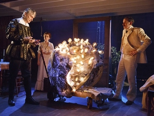 Myopic, dopey, and one-dimensional, the husbands cause far more problems than they solve, but society has not yet advanced to the point that, absent male aid, these women can clean up the messes on their own. Because the underlying themes regarding scientific development as represented by the fairs are not as robust as they need to be to support coming at the story from that direction, the disconnect with Ruth and Adeline leaves the play spinning its wheels early on and utterly senseless in its final scenes. Faced with the necessity of bridging the gap between earlier-then and later-then without possessing the proper building blocks, Bos and Thureen throw in a disorienting montage, the sudden promotion of a minor figure to near-secondary-lead importance, and a plot twist that not even the most charitable soul could consider improbable rather than impossible. Such tricks may work in something more openly fantastic, but The Light Years is too rooted in the rational for that kind of thing to fly here. It's a shame, too, since Butler's staging, if too often sluggishly paced, is creative and opulent. With the help of scenic designer Laura Jellinek, lighting designer Russell H. Champa, and sound designer Lee Kinney, he's transformed the playing space into a Victorian theater that's all about making magic with prehistoric technology. (The whimsical costumes, also wonderful, are by Michael Krass.) The swiftly moving set pieces, splashy proscenium light displays, and witty use of the "Silent Unfolding Announcer," a constantly rolling series of title cards that orients us to the time and place, are all part in parcel with the script, but Butler gives them bold life of their own. The same is not roundly true of the actors. Cash is quite fine as Adeline and Ruth, highlighting their innate inquisitive and enterprising qualities, without ever going further than she needs to in order to make them sympathetic. These are not traditional women, and Cash knows better than to play them traditionally; they're a new breed, and the touch of modernity fits in well with these surroundings. And Sisto is a comic dynamo as the ripped-from-real-life MacKaye, hilariously balancing artistic and scientific pretensions while maintaining the explorer's eye glimmer at every step along the way. The other performers work intensely, and land most of their laughs, but don't find the emotional connections that Cash and MacKaye do. Not that there's that much to find. Bos and Thureen's broad and sweeping strokes prevent them from illuminating much outside the foot or so in front of its face. It's an ambitious evening, to be sure, but considering the tragedy unchecked ambition wreaks on most of those in this play, in isolation, that's nothing to be proud of. Like the Spectatorium itself, The Light Years is memorable more for what it tries than what it accomplishes.