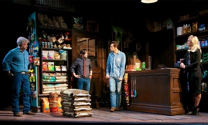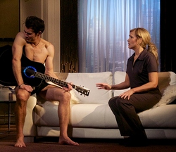 Good luck finding a funnier play about a sadder subject in the near future. Lonergan has so tightly interwoven the tragedy of Strings McCrane's life with the absurdity of finding solace everywhere except the places where it's most likely to be found that at least half the time you'll be embarrassed for not shooting out tears instead of cackles. (The rest of the time, your reaction is objectively okay. Probably.) Add in a director (Neil Pepe) and a cast (led by film and TV star Timothy Olyphant) who instinctively get what Lonergan is going for and deliver it with gusto, and you have a punchy, pointed comedy that lands with appealing ferocity. (For most of the evening anyway, but we'll get to that.) And, yes, you really are asked to absorb what, in any other circumstance, would be a prickly plight. Strings (Olyphant), a meganame country singer who's lately branched out into acting, is first seen in a Kansas City hotel room, still reeling from the death of his mother earlier that morning. His only confidant, the only one who understands him, is his best-friend-slash-personal-assistant Jimmy (Keith Nobbs), who's particularly invested in ensuring that Strings is forever happy, even in his darkest hours. To that end, he's hired one of the hotel's massage staff to help Strings relax, and when the woman, named Nancy (Jenn Lyon), arrives, of course she's a huge fan. And of course, the opportunity to put her hands all over Strings's mostly naked body is one she's not going to pass up. (Okay, she's married with two daughters, but so what?) Nancy's down-home small talk and unavoidable sense of hero worship is, for better or worse, just what Strings needs, and before long, the two of them are hooking up and heading out to mom's funeral in Beaumont, Tennessee.