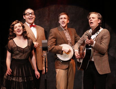 The two-and-a-quarter hour showa blend of history, performance, and sing-alongis a loving and knowing tribute to folk music as a venue for communal celebration and a consciousness-raising voice for peace, freedom, and social equity. And while it cannot possibly do justice to the entire range of folk music with roots in the United States and Canada (which also gets a nod), it amply succeeds in its mission of being a "progressive feast," taking us from the early field recordings collected in the 1920s and 1930s up through the time of its greatest commercial and popular success in the 1960s. During the course of the evening, a talented group of nine singers and musicians perform some three dozen songs, many of which will undoubtedly bring back memories for members of the audience whose lives were touched at one time or another by the music. Rather than simply play and sing, the cast members portray a number of real-life folk singers, from Guthrie, Seeger, and Lead Belly to the Kingston Trio, Peter, Paul, and Mary, and Bob Dylan (and his "scandalous" use of electric guitar during the 1963 Newport Folk Festival.) In making decisions about what moments to include, Mr. O'Neill, who also directs, has opted to touch only lightly on the decidedly left-leaning values embodied in the music. Unionism gets one song. The gentle "Where Have All The Flowers Gone" represents the anti-war protest movement. "We Shall Overcome" honors the struggle for African American civil rights. And there is only a brief mention of the Weavers' run-in with Senator Joseph McCarthy's House Un-American Activities Committee. Video projections of scenes depicting union activities, the plight of refugees from the Oklahoma Dustbowl, anti-war demonstrations, and the battle for civil rights serve as backdrops to the music. There is, however, one point that the show hits upon more emphatically, and that is how often the original voices, and sometimes even the intent of the music, became lost in the shuffle of "progress." Observe what happens with "There Is A Meeting Here Tonight," and consider the staging of the numbers, in which some singers are set behind scrims away from the spotlight, while others are shown front-and-center as they would have been seen in clubs or on television, or heard on financially successful recordings. Just something to ponder while you are being caught up in the terrific performances. Outstanding among the cast are Jennifer Leigh Warren, whose voice soars with the passion of blues, gospel, and an enthralling rendition of "We Shall Overcome;" Nicholas Mongiardo-Cooper, who channels Cisco Houston as he gives us the sadly still-relevant "Deportee," a 1948 song about Mexican migrant workers; and Justin Flagg, who serves as a stand-in for the indomitable Pete Seeger. Mr. Seeger was the most public voice for the folk music scene and served as its ardent purveyor for over 70 years, until his recent death. Mr. Flagg honors Seeger's banjo picking, his ability to get audience members to willingly try their hand at singing in harmony, and his undying commitment to the music and to the cause of social justice. It may be that we will never see a resurgence of the folk scene as it played out through much of the twentieth century, but surely, as the Weavers once gloriously sang and as Lonesome Traveler reminds us, "Wasn't That A Time!"