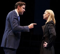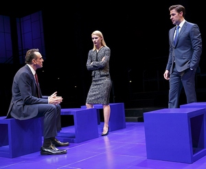 There's no reason, of course, you can't have a piece driven by an antihero, or for that matter a group of them; David Mamet made his career on writing play after play that did just that. But Mamet avoided the kind of traditional moralizing that Burgess embraces (one assumes the only reason Jenny doesn't twirl her mustache is that she's a woman) and created an entire electrifying patois that made their millions of bullet-shaped words caress your ear despite their vileness, something that Burgess has not yet managed. The endless arguments are, simply and wholly, Seth versus Jenny. Rick may occasionally lean (or, because of carefully timed events, be pushed) in one direction or another, but he and the circumstances surrounding him are malleable right until the very end. The decision he ultimately makes will not be revealed here, but does it need to be? How else could any work like this end? Kail's ultramodern production is sharp and attractive, finding the pulse-pounding rhythms in everyday pacing, and its in-the-round configuration in the Martinson keeping the action immediate and its participants never far from your judgment. And Rachel Hauck's blue box of a Mondrian-inspired set, Clint Ramos's cream-of-the-crop costumes, and Jason Lyons's urgent lighting are potent complements. But it's all fancy, towering dressing that can't camouflage the play's inherent one-dimensionality or add depth of color to a tale that's determined to stay swathed in black and white. As such, it's not exactly a surprise that Krasinski gives the only completely recognizable and well-rounded performance: He shows you how Seth is forever teetering between his worst and better natures (before, sigh, always landing on the latter), and injects a real dynamism into his fight for his cause. It's not at all a comic rolesorry, Office fansbut Krasinski nonetheless makes it bright, energetic, and suave. (You certainly don't have to worry about not finding virtue appealing.) De Silva gives a more nakedly sympathetic reading of Jeff, which works well enough up until the final scenes, when he must go places we're not prepared for; it's not quite believable that this Jeff contains the levels we're forced to accept so late that he does. Rick's primary emotion in Azaria's portrayal is exhaustion, which is understandable, but does get tiring on its own termsthe question of whether Rick has been beaten down by the world around him or was hardly a go-getter in the first place would drastically change the evening's tone, but Azaria hasn't made a firm decision about which applies. Then there's Danes. Though a gifted screen actress, she's failed to imbue Jenny with the barest smidgen of humanitythis woman is a walking mannequin who talks with just the clipped, emotionless voice you'd expect of one. She gets no help from the script on this scoreJenny, apparently intentionally, has literally no redeeming characteristicbut it's such a flat, disinterested take on the part that Jenny is impossible to take seriously as the bad guy. She's impossible to accept at all. Not that you're really supposed to. Everything about this play pushes you to disdain Jenny and her acidic philosophies as totally as she does Seth's quasi-altruism. But if this can't or won't be any more than a mind-numbing melodrama, is it too much to ask that there at least be a villain we can hiss? Burgess, Kail, and Danes can't even give us that. Yet another reason Seth is right: Just as money can't guarantee salvation, love, or success, in Dry Powder it can't lead to so much as a basic good time.