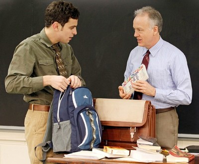 Each of those six perspectives belongs to someone who's been affected in a different way by the sudden death, by brain aneurysm, of a popular high-schooler named Dane (Josh Caras). The school counselor, Steve (Matt Dellapina), is barely out of college, and firmly of the belief that opening up early and often will spur recovery. Dane's girlfriend, Chelsea (Jessica Rothenberg), is stunned and flustered, unable to rouse herself to meaningful action. Best friend Kyle (Jake O'Connor) is obsessed with trying to fill all the voids Dane left behind. Rachel (Alexandra Socha), Dane's older sister, is increasingly resentful of the false shows of sympathy she detects from everyone around her. Dane's mom, Andrea (Kristie Dale Sanders), is predictably a wreck. English teacher Larry (Reed Birney) just wants to do his job and shut up about everything else. That none of these viewpoints is compatible with the others is evident from the outset. Larry resists Steve's attempts to hang up posters encouraging love and communication ("Everything will be all right" and "Lean on me," printed in terrifyingly bold letters, are typical slogans), for example. (The posters' startling contrast against Lee Savage's homey-institutional classroom set is its own delightful.) And every time Rachel and Chelsea get within three feet of each other, they're practically at each other's throatsin part because Rachel surmises, not without cause, that Kyle is trying to console Chelsea in a way Dane almost certainly would not approve of. Perhaps most notably, Steve is intent on getting Larry and Andrea to talk, even though they're the last person the other wants to seefor reasons related to Dane that neither dares utter aloud. Read has not engaged in complicated plotting; in fact, he's barely laid down a plot at all. But he and director Evan Cabnet have filled out the work with numerous minute details that recall Annie Baker's sterling Circle Mirror Transformation or Bathsheba Doran's just-opened Kin, both of which were directed by Sam Goldwhose super-subtle work Cabnet surreptitiously channels. The layers of complication between Larry and Dane power the play's mysteries, expanding and evolving well beyond the scant minutes the two spend sharing the stage. Rachel's disintegrating self-esteem becomes essential to describing her behavior as she lashes out against those she sees taking advantage of it. And Steve's early dopiness is so total that he stuns with his legitimate ability to become the glue that can repair mended souls.