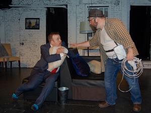 To get a sense of the overall work, imagine a mashup of novelist George Orwell and the absurdist playwright Eugène Ionesco, with a dash of Lewis Carroll thrown in for good measure. From Orwell, the playwright has borrowed ideas about totalitarianism and the brainwashing power of propaganda. Then he has shaped the play into a style resembling one of Ionesco's fanciful avant-garde works, replete with the master's penchant for peripheral philosophic meanderings. Occasionally, as well, he pays homage to Lewis Carroll's skill with logic and wordplay. Perversion takes place in a home that has been invaded by a pair of government inspectors, Tweedledee and Tweedledum types whose purpose is both bureaucratically ridiculous (they claim to be there to inspect the meat) and puzzlingly threatening (one of the items in their tool kit is a shotgun). As played by Harry Bainbridge and Tony Del Bono, these two, known, respectively, as Quibble and Scar, best measure up to the Ionesco-like absurdism that is the show's biggest strength. They, along with a third character, a TV camera-toting reporter named Major Importance (Robert Lewis), embody the play's main theme, how those in power manipulate language and images to modify people's thinking and cover up their high crimes and misdemeanors. On the back of Major Importance's vest, for instance, are the words: "All the news we want you to know," implicating the media in this conspiracy of what has come to be referred to as "alternative facts." There are many inspired moments and examples of smart writing within the play, especially when the dialog turns to elucidating the subterfuge that is used to garner the public's assent to questionable wars, including the killing of non-combatant civilians that we seem so ready to brush aside as "collateral damage." But these periods of focused lucidity tend to get watered down by a convoluted plot that wanders into more tangents than you'll encounter in an entire semester of a geometry course. The other cast members, representing the family that has been intruded on, serve mainly as foils for Quibble and Scar and the reporter, and they have precious little to do to move the story forward. The dual meaning of the play's title (one with a sexual implication, the other with a political one) is dispensed with early on, and the rest of the characters generally fade into the background. One, a young and frequently out-of-control little boy (played by Irina Kaplan) may be thought of as a stand-in for a certain recently-elected head of state, especially when he is allowed to operate the controls to an actual weapon of mass destruction of which he has no understanding. The playwright, Mr. Blake, who also directs the production, says that Perversion has been "extracted" from an as-yet unpublished novel. His decidedly stream-of-consciousness style may very well work for a piece of experimental fiction. But it does make for some rough going for an audience trying to absorb the free-flying loose elements of the play, which cries out for trimming and editing to make it more accessible.