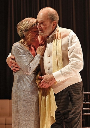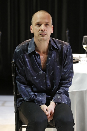 One thing that's abundantly clear in this revival, distant and confused though it frequently may be, is that this rot is, above all else, institutional. What makes these people susceptible to this sickness is the same thing that allows them to inflict it on others in the first place. Claudius, who killed his brother King Hamlet and ascended to his place on the throne; Gertrude, who bed-hopped to the current king's bed from the last one's; their doddering, scheming attaché Polonius and his opportunistic children... From a very real standpoint, don't they all deserve what's coming to them? This Occupy Elsinore spin on William Shakespeare's classic-to-end-all-classics is evident from the first scene, set at a wedding banquetor, wait, is it a funeral banquet?table around which the company sits. (The monochromatic scenic design, which counts thick carpeting, white leather sofas, and a flowered canopy, is by Walt Spangler, and is lighted by Justin Townsend.) As Claudius (Harris Yulin) toasts, each of them is engaged, perhaps, but also oblivious, decked out in luxurious black-and-white finery (by Constance Hoffman) that identify a searing disjunction between In Here, where anything goes, and Out There, where there's nothing they need worry about. And so it falls to Prince Hamlet (Peter Sarsgaard), in theory the rightful heir to the throne, to bridge that gap, by any and every means necessary. Whether or not that's exactly Hamlet's plan is not quite clear from Pendleton's take, but it's also largely immaterial. What matters more is that unlike in most productions, here Hamlet is daft from the get-go. The first words from his mouth are whining, importunate, connected to no sense of titled decorum, and in no way acknowledging that a world outside his field of view exists. In stark contrast to his kin, Hamlet evinces no breeding, no restraint, and, worst of all, no acknowledgment that his behavior is anything other than the only way it could be. The defeated, acquiescent tones of the others hint, too, that this is no new condition, but something to endure rather than fix.