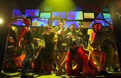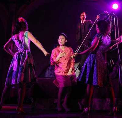 That's because Talking Heads's David Byrne, who conceived the evening, wrote the lyrics, and with Fatboy Slim composed the music (Tom Gandey and J Pardo are credited with "additional music"), and director Alex Timbers (Bloody Bloody Andrew Jackson) have crafted less a traditional show than a rollicking night at a dance club. As part of that, they have decreed that you will be on your feet, following around (or, depending on your predilections, avoiding) the action for the proceedings' full 90 minutes. This includes a fair amount of walking around the space, dodging set pieces (costumed security guards ensure you don't get squashed by a spinning platform), and even, yes, a bit of Annie-B Parson's choreography. (Rest assured, it's simple step-to-the-right-step-to-the-left-raise-the-roof kind of stuff.) If you're initially confused about what exactly any of this has to do with the show's subject, Imelda Marcos, the controversial first lady of the Philippines who with her husband Ferdinand was driven out of power in 1986 after 21 years, it doesn't take long to learn the answer. The Philippines, our "DJ" explains early on, has long been obsessed with all things from the United States, so telling a story to that audience using a vernacular familiar to it makes a certain sort of sense. Thankfully, it doesn't become more confusing as the show zips along. We're first introduced to Imelda (Ruthie Ann Miles), who grew up in poverty with her best friend Estrella (Melody Butiu) before romancing the charismatic politician Ninoy Aquino (Conrad Ricamora) and then the much more successful Ferdinand (Jose Llana). He takes her to the president's mansion, and then into infamy by imposing martial law and other nefarious policies on his people.