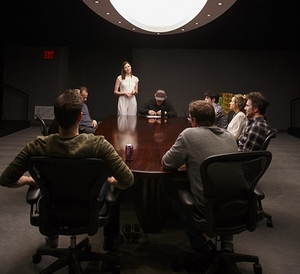 If it seems silly to you to ascribe such titanic importance to the (relatively) simple act of storytelling, that's understandable, but don't expect to hold on to that prejudice for long. In the relatively short running time of The Antipodes (just under two intermission-free hours), Baker, her director Lila Neugebauer, and their cast are remarkably good at ramping up the urgency. Though the action takes place only in a single locale, a conference room (crisply designed, with soft gray walls and a sharp wooden table for 10, by Laura Jellinek), there are plenty of hints that everywhere else is falling apart and that maybejust maybewhat's happening here can stem the tide. Not that most of the people involved see it that way. For most of them, it's just another job, albeit a prestigious one. Their leader, Sandy (Will Patton), was the mastermind behind Heathens, a popular TV series (or maybe movie?) that's described as "a success in every way," and is now aiming to replicate his accomplishment through the same means. To that end he's recruited two of his previous writers, Dave (Josh Charles) and Danny M. (Danny Mastrogiorgio), as well as four new ones, Adam (Phillip James Brannon), Josh (Josh Hamilton), Eleanor (Emily Cass McDonnell), and, uh, another Danny M. (Danny McCarthy), who, for convenience sake, is referred to as Danny M2. Brian (Brian Miskell) takes notes on his laptop; Sandy's assistant, Sarah (Nicole Rodenburg), takes lunch and snack orders, and delivers word from the outside. The group's goal is to brainstorm and share their own personal experiences to craft the story that will serve as the foundation for this new project. Their first task involves naming any kind of monster that isn't a dwarf, elf, or troll. Then they swap anecdotes about losing their virginity; imagine the sorts of fantastic beasts that could exist on the opposite side of their fictional planet; muse on their competing perceptions of time, from two-dimensional graphs to spirals to the Hindu concept of yugas (four ages that subtly influence human behavior); and so on. As the days and weeks pass, it appears as though the exercises aren't yielding much fruit, and the tales become weirder and more wiry; Sarah even relates one she insists happened between her and her stepmother and stepsister, that bears an astonishing resemblance to a children's fairy tale. They try new exercises to stoke their flames, even as their numbers slowly thin, requests aren't addressed (there's a lingering argument over whether Josh is even a real employee), and Sandy gets caught up in a series of misfortunes that mirror those of the angering environment that's roaring everywhere but the writer's room. And what's with the former employee who, one day, literally just vanished into nothingness? Things become less and less normal as the play unfolds, yet Baker keeps them anchored to a universe we recognize; their plights may be unfamiliar, but the demons they're fighting are all too familiar. Even when things spiral completely into craziness (which, perhaps unsurprisingly, correlates with the characters' nadir of imagination), a set of rules applies to keep nudging us and them forward. Like Baker's Pulitzer Prize-winning The Flick and, to a lesser extent, her John (which also premiered at the Signature in 2015), words and occurrences have conflicting layers of meaning that both throw into question everything that happens and provides answers that, though occasionally cryptic, tell you far more than facts ever could. These artists go all the way with it, though, and that's a big part of why The Antipodes works so well. Baker's relentless writing leaves you feeling as trapped and as vulnerable as the writers. Neugebauer's ultrasmooth staging covers epic time spans in seconds, and includes some of the best non-special special effects I've ever seen. (I became obsessed, for example, with food containers that appeared out of thin air.) And the physical production, which also includes surprisingly witty costumes for Kaye Voyce (most of Sarah's many wardrobe changes got entrance laughter) and superbly subtle lighting from Tyler Micoleau and sound from Bray Poor, adroitly captures the impossible notion of trying to bottle inspiration. Because the entire cast is excellent, singling out any is a challenge; each rips through choice moments with masterful skill. Charles's hardened veteran, McCarthy's soft-skinned newcomer, Hamilton's confused go-getter, McDonnell's pungent earnestness, Mastrogiorgio's brash veracity, and Brannon's plainspoken dream-spinner get the most play, and dole out bathos, hilarity, and chills in equal quantities. Miskell's focused Brian, Patton's battle-scarred Sandy, and Rodenburg's dopey-efficient Sarah give you more to puzzle out, but pay significant dividends, especially later on. Let's just say that everyone has a crucial role to play in the development of this project. There's a lot that can be said about what results, but nothing should beBaker, as per her usual, builds the plot and its surrounding suspense until the final seconds, so pulling out any one brick would cause the whole to collapse. For a play this inventive, this fascinating, and this good, that's a crime for which I'm not willing to risk prosecution. Besides, there's an excellent chance that my interpretation (tied tightly to our current political scene, for the record) might not be yours; Baker says so much, and says it so boldly, that the specifics may well vary from hearer to hearer. That's typically how great stories function. But what's undeniable about The Antipodes is its confidence in the power of narratives to transform hearts, minds, and even societies. This is made most clear in the longest, most vivid, and most unhinged of the many stories we hear, which Adam relates in a fit of exhausted exasperation. The "great father" of his conception kindles wonders from his mind, which lead to creation and destruction beyond what anyone can envision, but whic