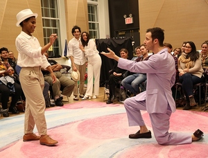 This has a wide-ranging impact on Ali's vision, if not always in the way the director intends. First, although (as Public Theater Artistic Director Oskar Eustis points out in a program note) Sebastian and Viola, the twins who are separated in a shipwreck, are illegal aliens hailing from Cuba, no deeper political message manages to bleed through. It proves to be merely background for this tangled tale of mistaken identity, as Viola finds work with and an affinity for the dashing Count Orsino while masquerading as the male Cesario. Their affections unable to land the right way, he's in love with the grieving widow Olivia, and she, in turn, is in love with the boy Viola most assuredly is not. Naturally, matters only get more complicated when the real Sebastian arrives, and no one knows who's supposed to be with whom. Throw in the additional plot of Malvolio, tricked into wooing a willing Olivia on his own, and you have plenty of raw ingredients for romantic craziness. Ali has concentrated it further here, boiling the action down to about 90 intermissionless minutes, and giving the various love stories roughly equal weight. This makes the evening one of unrelieved, and unrelievable, madcap abandon, with each new scene and complication colliding with the one before it as though it's trying to outswim a shark. This robs the play of a lot of its elevated poetic nuance, and makes the fun almost entirely visceral: There's nothing wrong with that, but it can be exhausting, especially since it's all keyed at a high-pitched comedic level that isn't going to stop for anything, including your fatigue. Again, it works for what it is: an ultraquick and dirty distillation designed to play in places, like prisons, schools, and outer-borough community centers, where Shakespeare rarely treads. But the character of Olivia is frustrating by any measure: She's hot for Viola-Cesario from the get go, all but ready to jump him (her?) from their first meeting, and the performer playing her (Ceci Fernandez) makes no secret about it. Starting her as a comic figure already in touch enough with her crushing feelings to rebuke them punctures the transformation she needs to make to a born-again creature later on; costume designer Dede Ayite tries to accomplish this by swapping out her black dress and veil for a gleaming white ensemble, but the effect fizzles. We've already seen Olivia bright from the inside out, so seeing it from the outside in isn't that much of a surprise. (Ayite's swank beachwear clothes are otherwise right on the money.) Even so, Fernandez is excellent as a smoldering foil for both brother and sister; as Orsino, Michael Bradley Cohen hits a lot of the same notes in a more understated way, playing up the double-take confusion of a man uncertain of just whom he wants. Danaya Esperanza is an edgy Viola and Sebastian Chacon a laid-back Sebastian, and the two play well off of each other and their love interests, despite, in everything from height to skin color, looking laughably unalike. (A bit has been added to the preshow speech begging us to pretend they're twins; you can, of course, but suspension of disbelief does only go so far.) David Ryan Smith is a conventionally fey Malvolio, but amusing enough; Christopher Ryan Grant, as Sir Toby Belch, and Aneesh Sheth, as Maria, strain to match him note for comic note. The live music, composed and performed by Michael Thurber (who also plays Antonio) and occasionally spelled by the lively Donnetta Lavinia Grays as the clown Feste, draws on the informal street sounds of steel drums (as filtered through a drum machine), thus setting a playful atmosphere in which anything can happen (an, in most cases, eventually does). The set (by Arnulfo Maldonado) isn't much more than a couple of floor drops and a few additional props, though that's more than enough to suggest a dangerous ocean, a relaxing swimming pool, a sweat-drenched boxing ring, and lots of other things throughout the night. As with so much else with this Twelfth Night, it's exactly what you need and no more. If this is understandable given the production's Lafayette Street pricing strategy (tickets are free, as they were at the community locations), Ali sufficiently justifies it that you won't fret too much about what's missing. The play can be more textured than this incarnation, but it's a lightweight amusement for kicking off the summer that's happy to not tax you too hard. And when you're basking in the beaming rays it delivers, chances are you won't find that much to complain about.
