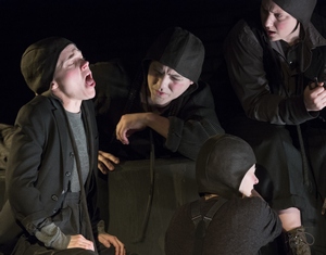 In 2015, the company gave us The Vast Machine, an examination of the heinous institution of slavery as seen through the eyes of the crew of a rogue slave ship, half of whose human cargo have already died in the hold. The previous year saw a chamber musical called Solitary Light, a haunting evocation of the notorious Triangle Shirtwaist Factory fire from 1911 in which 146 garment workers lost their lives. Now, with its presentation of Sidney Kingsley's 1935 drama Dead End, Axis has taken on the bleak story of the Great Depression and has jolted it into sentience, like a patient awakened reluctantly from an anesthetized sleep. Both Kingsley's original play and Axis's presentation of it paint a vivid portrait of the desperate and unfulfilled lives of a motley collection of homeless and near-homeless youngsters and adults brought to their knees by the economic nosedive. No money. No jobs. No prospects. No hope. For these characters, there is no "sunny side of the street," a fact that is reinforced throughout the entire production with its prolific use of a palette of stygian hues in Chad Yarborough's set design, Karl Ruckdeschel's costumes, and David Zeffren's shadowy lighting. Even the props (a deck of playing cards, a cigarette fashioned from a bit of horse manure, some dollar bills waved about by one of the few who has any money) are totally black. Dead End, like others of Axis's productions, eschews traditional storytelling in favor of a more expressionistic approach. But unlike other abstract or surrealistic works you may be familiar with, the characters slowly emerge from a sea of nameless faces and types to take on an unexpected level of humanity and individuality. Not much happens, at least not in the usual plot-driven theatrical sense; we are there to bear witness and perhaps to feel some degree of responsibility for our brethren. We watch as a group of restless, underfed, and purposeless street urchins (the so-called "Dead End Kids" later made famous in a series of films based loosely on this play) argue, fight, tease, threaten, and cling to each other in a world that gives them no support nor allows them to have any control over their lives. One of them suffers from tuberculosis. Another has spent time in a "reform school." Another gets into a knife fight and goes into hiding. The play's adults are hardly better off. There is Gimpty (George Demas), a trained architect who can only dream helplessly of rebuilding the neighborhood and replacing the tenement slums with decent and affordable housing. Drina (Shira Averbuch), a young working class woman, longs to make a better life for herself and her younger brother Tommy (Jon McCormick) after she has been left to raise him on her own when their parents died. A couple of other characters who are better off financially are not immune to the harshness of life. Kay (Britt Genelin), for instance, is living with a man who treats her cruelly but who has enough money so she thinks she can manage without love. And there is Baby Face Martin (Brian Barnhart), a thug wanted by the police, who is hanging around in the hopes of seeing his mother one last time; when they do meet up, the encounter is painful to both of them. Dead End is as far from a "feel good" play you are likely to come across. The depictions of the characters' lives may seem melodramatic and clichéd, but their experiences are rooted in reality, as the playwright well understood. The problems faced by Gimpty and Drina and Kay and the street kids (poverty, homelessness, joblessness, hunger) are still the lot of millions of people today. Randy Sharp, who directs the production, and the committed cast and crew, do an excellent job in bringing this stark play from the Depression era to a contemporary audience.
