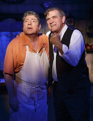 Sorry for spoiling so many details of Lauria's writing, and his central characters of Charlie (whom he plays himself) and Dom (Richard Zavaglia). But when a play has only one joke, and it's so intricately intertwined with the breathlessly hyperextended plot, doing so is almost impossible avoid. (At least I didn't tell you how Charlie and Don dispose of their bodies.) To give credit where it's due, Lauria has put as friendly a spin as possible on the traditional mob plot. Certainly the result, The Odd Couple by way of Goodfellas, is not a bad idea. And thanks to his amiable writing and performance, which is choked with excitement but never by it, Dinner With the Boys maintains throughout the warm nature that's by far its best feature. That's something. Unfortunately, it's also the only thing. This is, at the most generous, a Saturday Night Live sketch stretched out to nearly two hours (counting intermission). Charlie and Dom bicker kindheartedly about their work, their food, the recent mysterious death of their friend Leo, and the troubles they're having working for Big Anthony Jr., who recently took over the family "business" from his father. "Easy, easy," Dom says at one point. "This is no good for your blood pressure, Charlie." "A lot you care for my blood pressure," he spits in response. Dominic comforts as only he can: "You won't be able to digest your dinner. You'll get agita!" Their pseudo-marital bliss is eventually interrupted, because it has to be, by the arrival of Anthony (Ray Abruzzo), who makes clear in no uncertain terms that neither of them is likely to see the end of the evening. Secrets, sauce, and probably some other red stuff get spilled. (Even Lauria can't make a show about hit men completely fluffy.) The second act is both more and less of the same, unfolding as it must in the aftermath of Lauria revealing everything and then having to somehow fill another 45 minutes before the lights can come down on the preordained resolution. It's all pretty difficult to swallow (pun not intended). Frank Megna's direction doesn't help: It's aggressively melodramatic, and overly relies on Jill Nagle's lights to elicit guffaws from moments that otherwise don't warrant them. (Jessica Parks's cozy New Jersey set is fine, as are Patricia E. Doherty's costumes.) There's no hint of understatement or effortlessness, which leads to underscoring every moment too blatantly for laughs to organically come. Zavaglia's too-feminine turn as Dom contributes to the same problem. He comes across as too "wifey," leaving nowhere for the humor, or Dom's relationship to Charlie, to bloom, and thus is rarely as funny as he acts like he is. Lauria's sitcom-father-like style, squishy but lined with observable edge, is much more accurate and effective. For the play to have a shot at working, however, all its actors need to be firing on all possible comic cylinders, and no one, including Abruzzo (who's got the gangster bit down but overplays the lighter moments), is here. (This full cast did the show at the New Jersey Repertory Company last year.) You can get an idea of what might have been from the actors who did the play's first public reading in Los Angeles a number of years ago: Charles Durning, Dom DeLuise, Peter Falk, and Jack Klugman. One suspects that their personalities and verve, honed over decades in the spotlight, could have filled in many of the gaps that cause Dinner With the Boys to leave you otherwise feeling very, very hungry.
