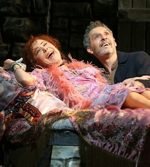 Their task is a difficult one for many reasons. Perhaps the most instantly visible is that, in this 1968 adaptation of Nikos Kazantzakis's 1946 novel Zorba the Greek, they're playing the roles of Zorba and Madame Hortense, which were squeezed of every drop of life-affirming juice by Anthony Quinn and Lila Kedrova in the 1964 film. (So defining was the pair, in fact, that they repeated their film roles in the musical's 1983 Broadway revival.) But if there's even a hint of apprehension of unworthiness, it's not all visible in either of Turturro's or Wanamaker's zesty portrayals. Both capture a fabulistic fearlessness that's just right for two people who choose anew every day to live as though there will never be another moment to savor. Turturro embodies this most readily, his grabbing, voracious gusto tumbling from him from behind a wall of discontent; he really projects the sense that he's desperate, even angry, about the prospect of missing a second of what existence has to offer. Yet he prevents this lustiness from devolving into caricature, instead maintaining a tight grip on his feelings so you know, at every step along the way, that he's making a choice few others can. Wanamaker's spin is more subtle but no less commanding, finding an effervescence within the ever-accelerating regression of an ailing French woman back to her finest self at her 16th birthday party. She's coquettish, yes, with an obvious yen for tasting the love she's been denied for so long. But just as powerful a force is her innocence, her unshakable belief that the itinerant, constantly straying Zorba can and will be tamed, and that she'll come to mean as much to him as he already does to her. Deluded? Sure, but also endearing, and here, that matters more. Neither possesses a singing voice worth speaking of, though both manage to stay in tune, say, a solid 80 percent of the time. But when Turturro bursts forth with his life philosophies in "The First Time" or "I Am Free," or Wanamaker muses on the power of affection ("Only Love") or her own wiles ("No Boom Boom"), or embraces her one perfect day as she faces down her dubious eternal reward ("Happy Birthday"), you're seeing performances of such thrilling musicality and dramatic intensity that everything else ceases to matter for just a few minutes.