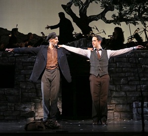 Nor do other, still more significant, echoes. Telling of the young Niko (played here by Santino Fontana), who inherits a mine in Crete and upon arriving to take possession of it becomes wrapped up in Zorba's advice and an ill-advised love affair with a local widow (Elizabeth A. Davis), it's drenched in darkness and tragedy almost throughout. And being set apart from the viewer still further by a tavern-philosophy framing device that finds its perpetrator, known only as The Leader (Marin Mazzie), and her acolytes weaving into and out of (and comment upon) the action, cools things off still more. Unlike Fiddler and Cabaret, however, Zorba finds no exaltation in these events and has little fun in presenting them; it has often been labeled "depressing," and that's not an unfair assessment, particularly given a parade of nearly nonstop horrors in the second act. True, Stein's book has been gutted by John Weidman for his "concert adaptation," its chemistry and structure vitiated to the point that you may well have no clue what function characters like The Leader, the boy Mimiko (Adam Chanler-Berat), the brooding young man Pavli (Carlos Valdes), or Pavli's father (Robert Cuccioli) are supposed to serve. (My guest, unfamiliar with the stage version, said he could hardly follow it at Encores!, despite knowing the novel.) But even when performed full, the book is languid and listless, and the score, though deeply flavorful thanks to Don Walker's expert orchestrations (a mandolin, a bouzouki, an oud, and a dumbeg are among the instruments), second-rate Kander and Ebb at best. This is a show that speaks unmistakably of (and, one suspects, to) its era and its creators' careers, but otherwise doesn't have a lot to offer. It may capitalize on what made Fiddler and Cabaret great and timeless, but it translates those qualities into, at best, a shaky homage, or, at worst, a cynical photocopy. Walter Bobbie has directed respectably, but can't compensate for either Weidman's narrative shreds or the material's naturally sluggish pacing. Choreographer Josh Rhodes's dances (sirtaki, as one might expect, receives a heavy focus) play somewhat better, but there's a heaviness and a joylessness about them. Much the same be said of Anna Louizos's sets, William Ivey Long's costumes, and Ken Billington's lights, or most of the performances. Fontana strikes the proper notes of unforced charm in his naïf role, and presents an appealing vessel from which Niko's soul can be filled. But all of the other supporting actors seem ill at ease, even vocally (Mazzie's and Davis's voices do not sit well in their songs), which casts an undeniable pall on the evening. You're more grateful than ever, then, when Turturro and Wanamaker are able to slice through it to find so much affectless humanity waiting beneath. When their Zorba and Hortense are pursuing each other, and by extension their best-possible selves, you can't help but believe that they really are showing you, as a lyric runs, that "life is how the time goes by." When they're not at center stage, alas, that time goes by very, very slowly.