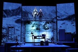 With a book by Joe DiPietro, whose credentials include such audience-pleasers as Memphis and The Toxic Avenger, and songs by Brendan Milburn (music) and Val Vigoda (lyrics) of the Indie band GrooveLily, Ernest Shackleton Loves Me stars Ms. Vigoda as Kat, the overworked and under-supported mom. As the show opens, Kat is pretty much at her wit's end. She has been up with the baby for 36 hours, and she has just lost (to a high school student!) what she expected would be a breakthrough job writing John Williams-like music for video games. Meanwhile, the baby's father, in a permanent state of arrested development, has left town to perform in a Journey cover band. In her sleep-deprived and suggestive state, Kat decides what she needs most in her life right now is a little romance. So she joins a dating site called "Cupid's Leftovers.com" and records her intro. Before you know it, she begins to get hits from famous dead explorers, among them Ponce de Leon and Jacques Cousteau. She's not interested, however, until she is contacted by Ernest Shackleton (a delightfully talented Wade McCollum, who plays all of the male roles), the real-life British explorer of the Antarctic who fearlessly kept his team alive for close to two years after their ship was trapped in the ice hundreds of miles from the closest outpost. The minor fact that Shackleton's exploits occurred in the early part of the 20th century is moot to this fantasy-infused show. Before you know it, Kat and Shackleton are chatting via Skype (we get to see what Kat sees via projections and videos of archival footage of the actual expedition, shown on a large screen behind her). Eventually, Shackleton appears in the flesh at Kat's Brooklyn apartment via (how else?) her refrigerator, and he whisks her off to Antarctica. Although the explorer is a bit of a stuffed shirt ("It is I, Ernest Shackleton" is how he puffily refers to himself throughout the show), Kat learns to admire his courage and determination as he fights against all odds to keep his crew alive. There is little by way of set design beyond the large video installation and a few props, but imagination and the energetic performances take care of the rest. Musically, the show is filled with thumping songs ranging from pop tunes to sea chanteys to soaring power ballads to a variation on the old music hall favorite, "It's a Long Way to Tipperary." Val Vigoda is an exceptionally fine musician, doing stellar work on the electric violin, and Wade McCollum plays a mean banjo as they perform songs with wonderfully uplifting lyrics (Sample: When you think that you're down/Fight as hard as you're worth/And you'll find that you have/All the strength that you need. Corny, perhaps, but the performances are so splendid, that you will find it hard to resist all of the positive energy that pours off the fine co-stars.