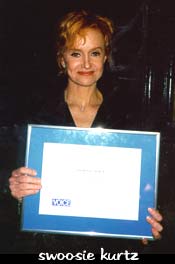 Rudnick spoke of his admiration for Margaret Edson. He explained how she is a kindergarten teacher and was called out of her classroom to learn she'd won the Pulitzer Prize for Wit. After learning this, she was eager to return to her classroom, where her students were doing a project with insects. He said, "I would have been out of there SO FAST! It would have been like, here kids, here's a can of Raid!'" During one award presentation, Phylicia Rashad misspoke and said "ball game" instead of "ball gown." She joked, "What can I do? I'm married to Ahmad. I see ball,' I think game'!" In a more sobering moment, The Village Voice's Michael Feingold read the names of those in the business who had died this year, noting his sadness at inheriting the responsibility from the late Ross Wetzsteon. He ended by saying, "We miss them, we mourn them, and we're grateful for what they left us." Acceptance Speeches: I don't know about you, but I was in total agreement with Rosie O'Donnell last year when she said that acceptance speeches should be funny or from the heart and NOT consist of a laundry list of names. As far as I'm concerned, at award shows nothing is more dull than listening to an endless list of names of people you've never heard of. Are these people so desperate to have their two seconds of fame that they will not forgive the winner if he or she doesn't mention them by name? I think it would be better for the winners to write a very nice thank you note to each person they would like to thank and not make us suffer through these lists. The following are some highlights from the acceptance speeches: Liev Schreiber (for his performance in Cymbeline): speaking of how much he learned from his director, Andrei Serban, he told of a dress rehearsal attended by his family and friends. During his heartfelt performance of a pastoral speech, he heard Serban's voice, with its heavy accent, over the loud speaker saying, "No, no, no ... stop ... stop ... What are you doing? You're so fucking boring!" and Liev thought, "Wow ... so this is what it's like to work with the Eastern Europeans ... " Dare Clubb (for his play Oedipus): compared rehearsals of Oedipus to "swimming in the Great Salt Lake ... no one sank!" Ronnie Burkett (for Tinka's New Dress): having brought his puppetry to NYC all the way from Canada, Burkett joked that "there is no place farther off-Broadway than Calgary, Alberta!" Lisa Crone (for 2.5 Minute Ride): (in a speech that was read for her) spoke of how they were sure they had a success on their hands with 2.5 Minute Ride because "who goes to the theatre more than gay people and Jews? We'll be attracting them like flies." As it turned out, it was harder to draw them in. She joked, "Some would prefer to spend the night in a concentration camp" than come to the show. Nicholas Martin (for his direction of Betty's Summer Vacation): noted, "A lot of Americans are winning here tonight ... do they know about this uptown?" Ellie Covan (Ross Wetzsteon Award to Dixon Place): expressed surprise at winning since she hadn't "slept with any of the committee members!" Mia Katigbak (Grant to The National Asian American Theater ): explained that the National Asian American Theatre Company performs European and American classics " ... because we can!" She spoke of the frustration as Swoosie Kurtz (for her performance in The Mineola Twins): applauded The Village Voice for not always going with the flavor of the month. She praised the "breathtaking words of Paula Vogel," saying that "her nightmare was my dream come true." She added that "with this role I have been to the top of the mountain and looked down and I am not afraid." She ended by saying, "Between Myra's 32Bs and Myrna's 44Ds, my cups runneth over!" Kathleen Chalfant (for her performance in Wit): (who wept at the standing ovation she received, Daniel Gerrol (for Sustained Excellence of Performance): cracked everybody up when he told us he couldn't understand the mad rush to get an OBIE because he'd thought it was a diminution of the word "obituary." There were performances from two shows, Richard Maxwell's Debate and Ruth Margraff and Matthew Pierce's "Snowball" from The Cry Pitch Carrolls. They both defy description, and were thoroughly entertaining.