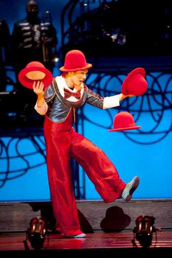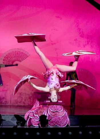 Any other company, with any less vision and even a moderately lower budget, would never be able to pull off such an accomplishmentespecially given the baggage the show has carried with it to opening night. I'm not even talking about the gossip mill. Yes, there have been months of whispering of "tryout hell," with the show lingering in development and provoking incessant rumors about these performers or that composer being let go, that Cirque bigwig clashing with writer-director David Shiner (of Fool Moon fame and Seussical infamy), and so on. And, yes, the final product looks jagged and inconsistently conceived, if not ragged or distraught. No, far more potentially dangerous to Banana Shpeel's fortunes are the basic details of its current existence. Combining two sets of abundant clichésthe Cirque shows' Continental samplings (balancing acts! contortionists! juggling!) with American vaudeville's splashy, anything-for-a-thrill entertainment naturethe show has to work extra hard to locate within itself even a drop of original thinking. That it somehow manages to find a palatable enough balance between these incompatible performance styles to sustain a glitzyif, at nearly two and a half hours, overlongevening is no small achievement.